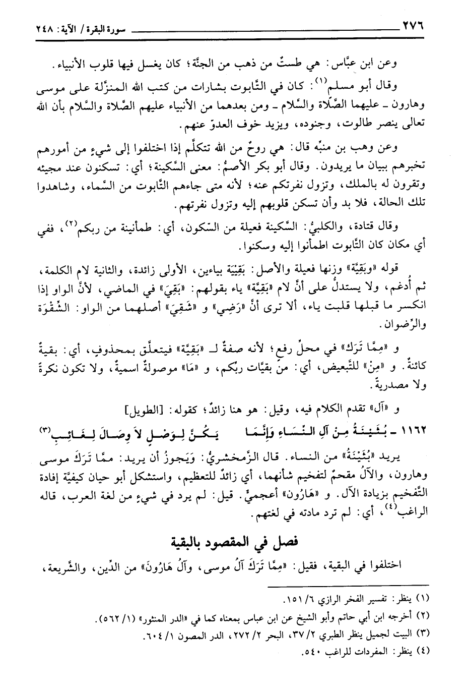 اختلفوا في البقية، فقيل: {مِّمَّا تَرَكَ آلُ موسى وَآلُ هَارُونَ} من الدِّين، والشَّريعة،