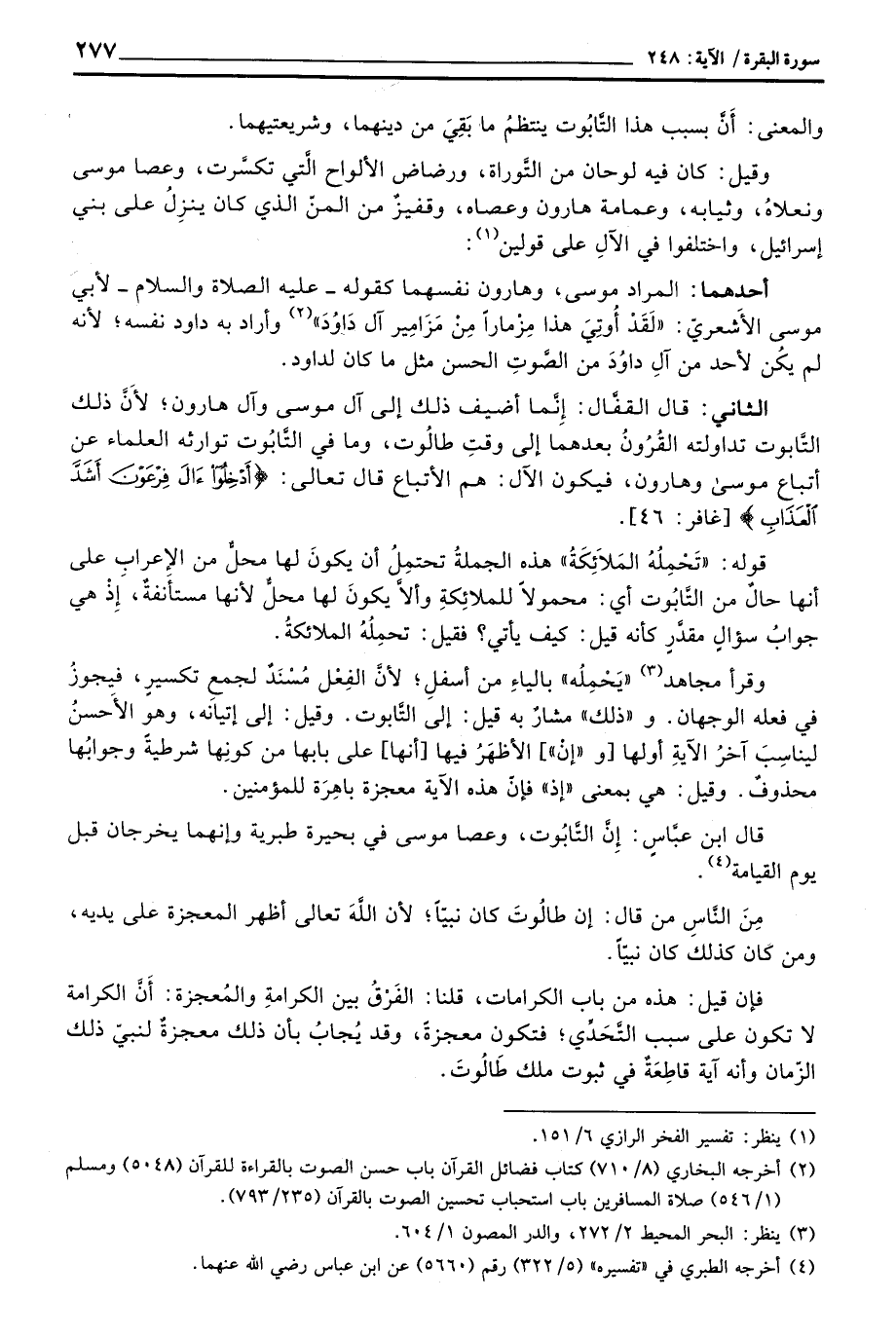 وقيل: كان فيه لوحان من التَّوراة، ورضاض الألواح الَّتي تكسَّرت، وعصا موسى ونعلاهُ، وثيابه، وعمامة هارون وعصاه، وقفيزٌ من المنّ الذي كان ينزلُ على بني إسرائيل، واختلفوا في الآلِ على قولين: