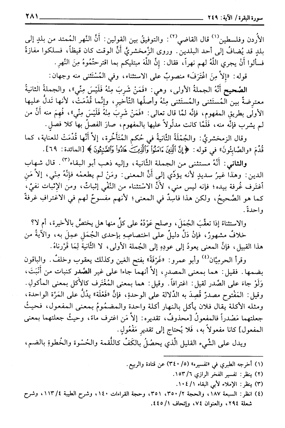 والثاني: أَنَّهُ مستثنى من الجملة الثَّانية، وإليه ذهب أبو البقاء. قال شهاب الدين: وهذا غيرُ سديدٍ لأنه يؤدِّي إلى أَنَّ المعنى: ومَنْ لم يطعمْه فإِنَّهُ مِنِّي، إلاَّ مَنِ اغْتَرَفَ غُرفة بيده؛ فإنه ليس مني، لأَنَّ الاسْتثناء من النَّفْي إثباتٌ، ومن الإِثبات نفيٌ، كما هو الصَّحيحُ، ولكن هذا فاسدٌ في المعنى؛ لأنهم مفسوحٌ لهم في الاغترافِ غرفةً واحدةً.
