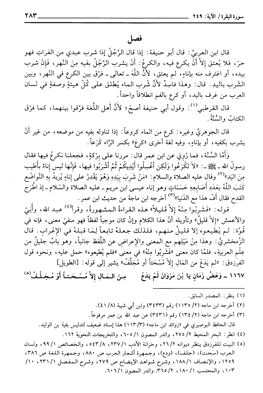 قال ابن العربيِّ: قال أبو حنيفة: إذا قال الرَّجُلُ إذا شرب عبدي من الفراتِ فهو حرّ، فلا يُعتق إِلاَّ أَنْ يكرع فيه، والكرعُ: أَنْ يشرب الرَّجُلُ بفيه مِنَ النَّهر، فَإِنْ شرب بيده، أو اغترف منه بإِناءٍ، لم يعتق، لأنَّ اللهَ - تعالى - فرَّق بين الكرع في النَّهر، وبين الشّرب باليدِ. قال: وهذا فاسِدٌ لأَنَّ شُرب الماء يُطلق على كُلِّ هيئةٍ وصفةٍ في لسان العرب من غرف باليد، أو كرع بالفم انطلاقاً واحداً.