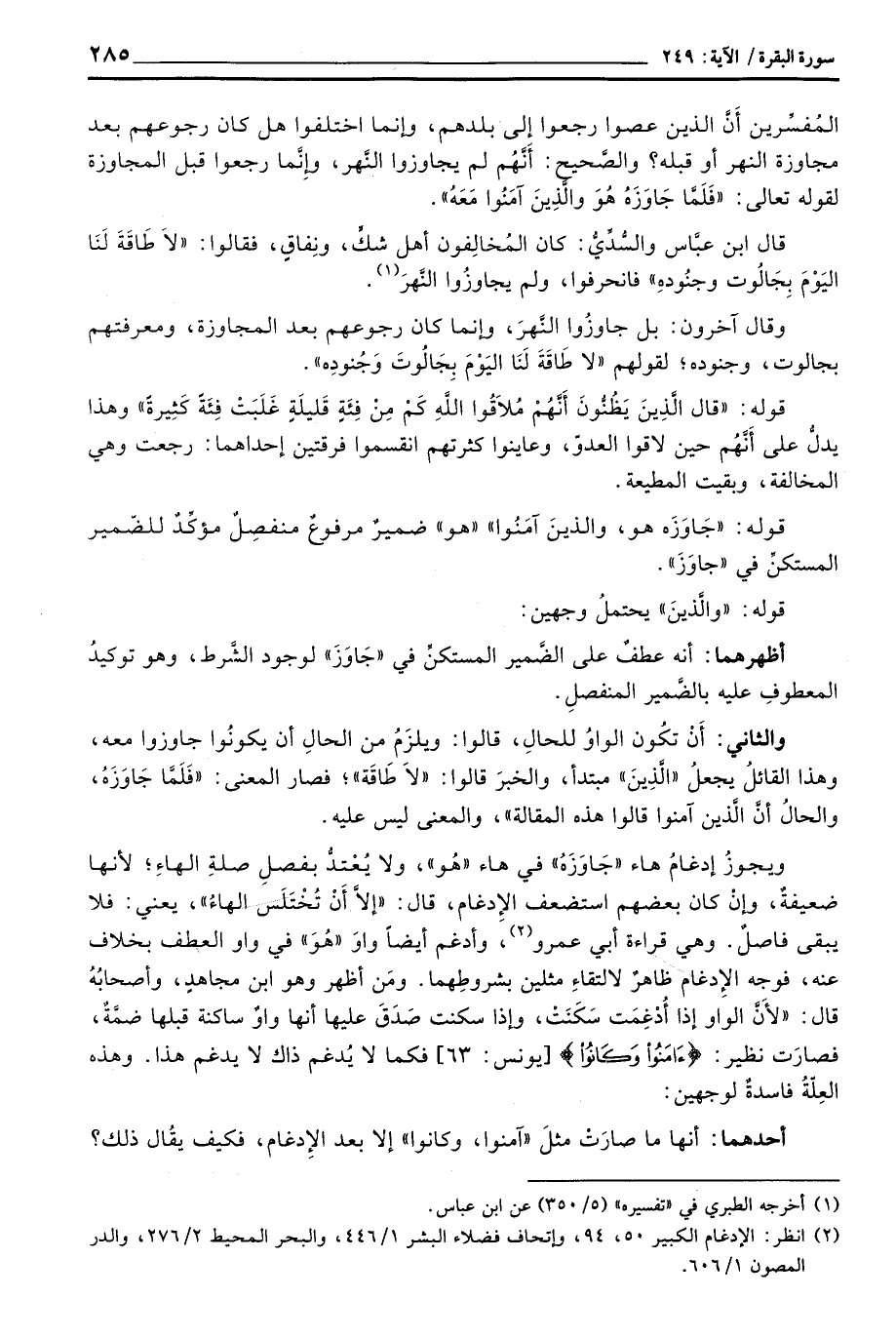 ويجوزُ إدغامُ هاء «جَاوَزَهُ» في هاء «هُو» ، ولا يُعْتدُّ بفصلِ صلةِ الهاءِ؛ لأنها ضعيفةٌ، وإِنْ كان بعضهم استضعف الإِدغام، قال: «إِلاَّ أَنْ تُخْتَلَسَ الهاءُ» ، يعني: فلا يبقى فاصلٌ. وهي قراءة أبي عمرو، وأدغم أيضاً واوَ «هُوَ» في واو العطف بخلاف عنه، فوه الإِدغام ظاهرٌ لالتقاءِ مثلين بشروطِهما. ومَنْ أظهر وهو ابن مجاهدٍ، وأصحابُهُ قال: «لأَنَّ الواو إِذا أُدْغِمَت سَكَنَتْ، وإذا سكنت صَدَقَ عليها أنها واوٌ ساكنة قبلها ضمَّةٌ، فصارَت نظير: {آمَنُواْ وَكَانُواْ} [يونس: 63] فكما لا يُدغم ذاك لا يدغم هذا. وهذه العِلَّةُ فاسدةٌ لوجهين: