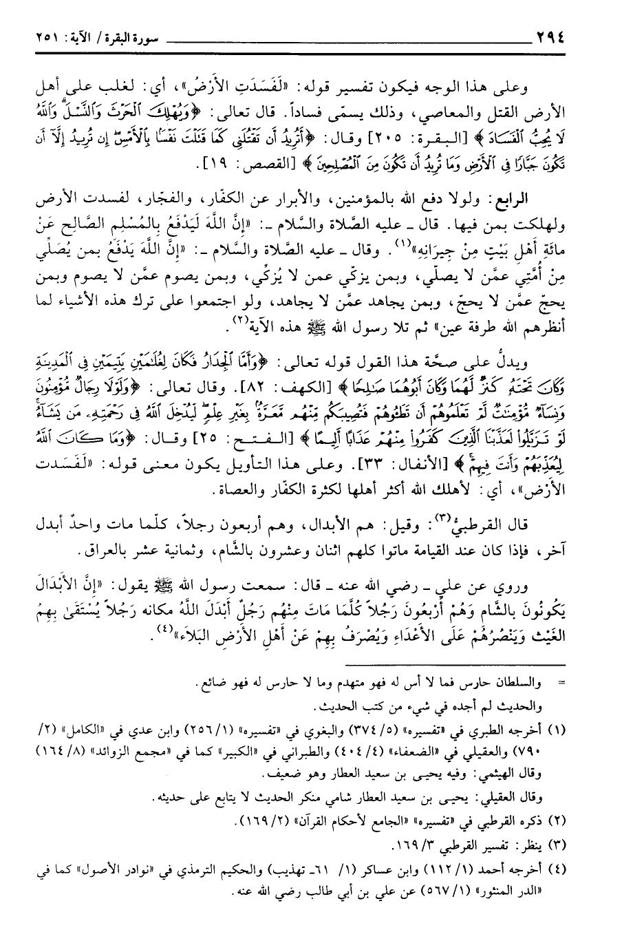 الرابع: ولولا دفع الله بالمؤمنين، والأبرار عن الكفّار، والفجّار، لفسدت الأرض ولهلكت بمن فيها. قال - عليه الصَّلاة والسَّلام -: «إِنَّ اللهَ لَيَدْفَعُ بِالمُسْلِم الصَّالِح عَنْ مائَةِ أَهْلِ بَيٍْتٍ مِنْ جِيرَانِهِ» وقال - عليه الصَّلاة والسَّلام -: «إِنَّ اللهَ يَدْفَعُ بمن يُصَلِّي مِنْ أُمَّتِي عمَّن لا يصلِّي، وبمن يزكّي عمن لا يُزكِّي، وبمن يصوم عمَّن لا يصوم وبمن يحجّ عمَّن لا يحجّ، وبمن يجاهد عمَّن لا يجاهد، ولو اجتمعوا على ترك هذه الأشياء لما أنظرهم الله طرفة عين» ثم تلا رسول الله صَلَّى اللَّهُ عَلَيْهِ وَسَلَّم َ هذه الآية.