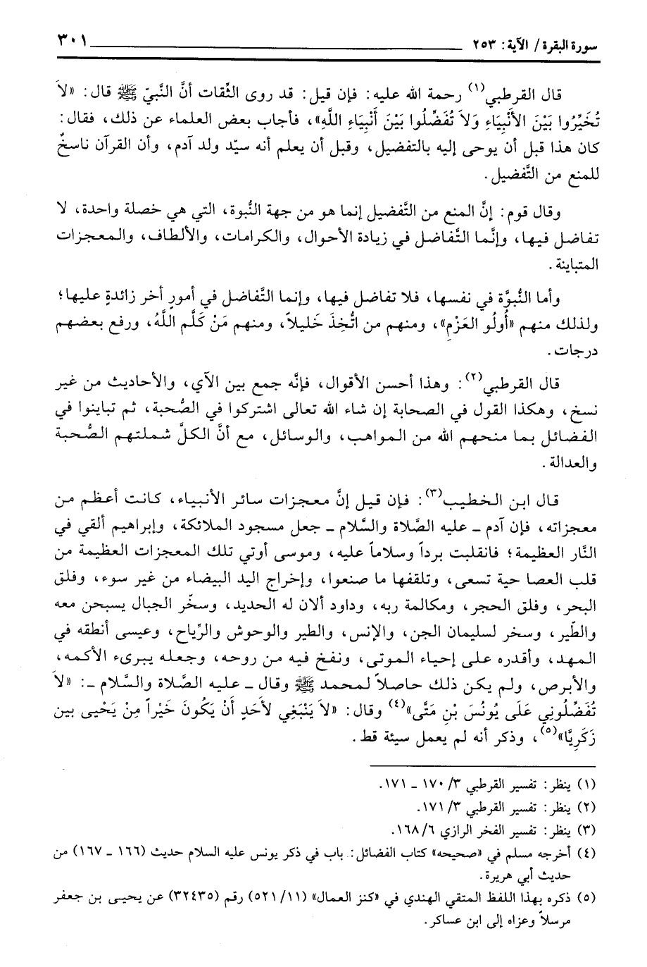 وأما النُّبوَّة في نفسها، فلا تفاضل فيها، وإنما التَّفاضل في أمورٍ أخر زائدةٍ عليها؛ ولذلك منهم» أُولُو العَزْمِ «، ومنهم من اتُّخِذَ خَليلاً، ومنهم مَنْ كَلَّم اللهُ، ورفع بعضهم درجات.