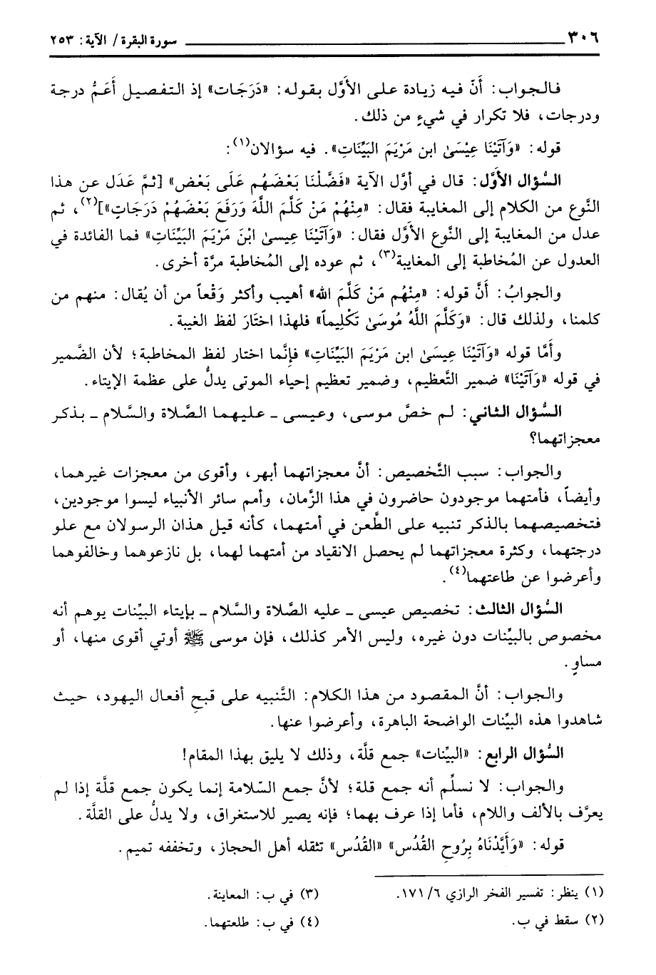 السُّؤال الأَوَّل: قال في أوَّل الآية: {فَضَّلْنَا بَعْضَهُمْ على بَعْضٍ} [ثمَّ عَدَل عن هذا النَّوع من الكلام إلى المغايبة فقال: {مِّنْهُمْ مَّن كَلَّمَ الله وَرَفَعَ بَعْضَهُمْ دَرَجَاتٍ} ] ، ثم عدل من المغايبة إلى النَّوع الأَوَّل فقال: {وَآتَيْنَا عِيسَى ابن مَرْيَمَ البينات} فما الفائدة في العدول عن المُخاطبة إلى المغايبة، ثم عوده إلى المُخاطبة مرَّة أخرى.