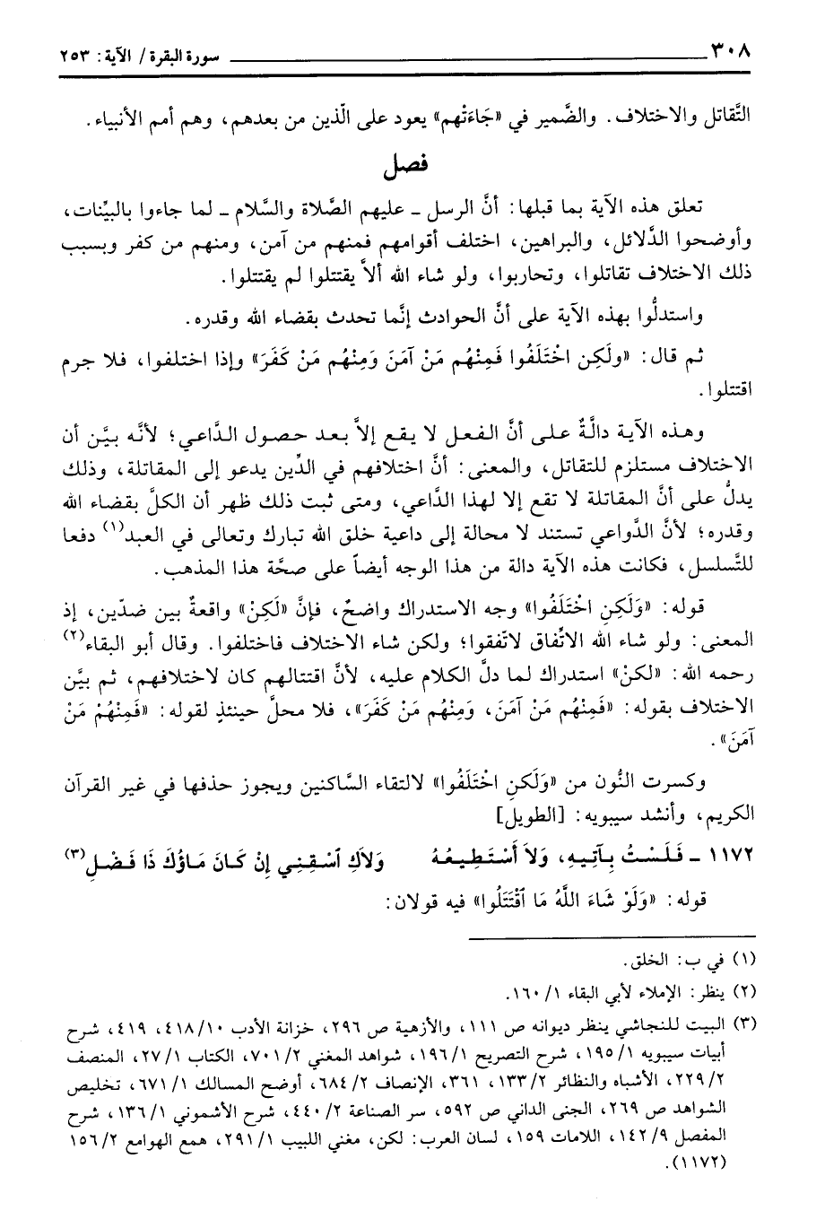 قوله: {ولكن اختلفوا} وجه الاستدراك واضحٌ، فإنَّ «لَكِنْ» واقعةٌ بين ضدّين، إذ المعنى: ولو شاء الله الاتِّفاق لاتَّفقوا؛ ولكن شاء الاختلاف فاختلفوا. وقال أبو البقاء رَحِمَهُ اللَّهُ: «لكنْ» استدراك لما دلَّ الكلام عليه، لأنَّ اقتتالهم كان لاختلافهم، ثم بيَّن الاختلاف بقوله: {فَمِنْهُمْ مَّنْ آمَنَ وَمِنْهُمْ مَّن كَفَرَ} ، فلا محلَّ حينئذٍ لقوله: {فَمِنْهُمْ مَّنْ آمَنَ} .