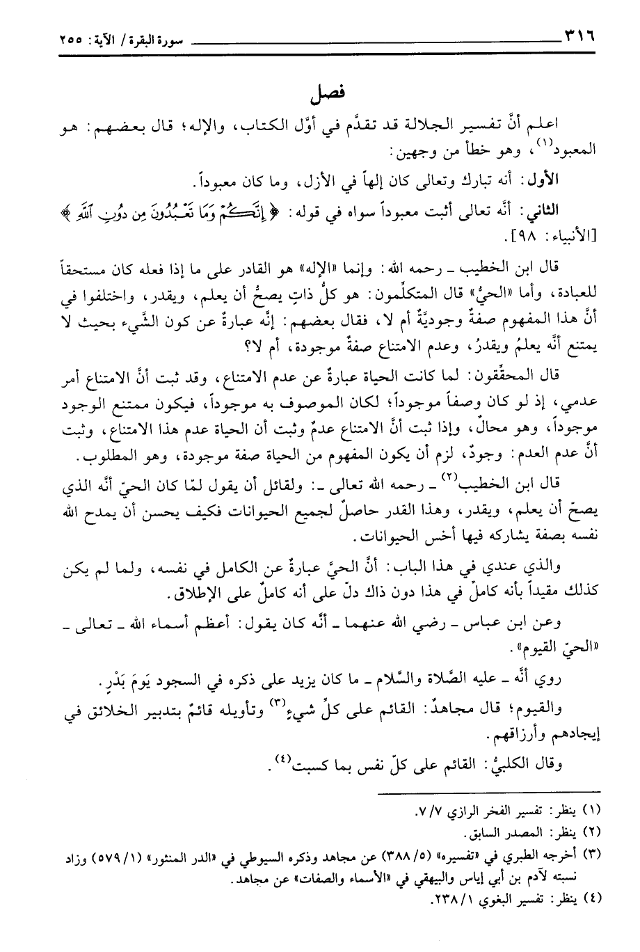 قال ابن الخطيب - رَحِمَهُ اللَّهُ: وإنما «الإله» هو القادر على ما إذا فعله كان مستحقاً للعبادة، وأما «الحيُّ» قال المتكلِّمون: هو كلُّ ذاتٍ يصحُّ أن يعلم، ويقدر، واختلفوا في أنَّ هذا المفهوم صفةٌ وجوديَّةٌ أم لا، فقال بعضهم: إنَّه عبارةٌ عن كون الشَّيء بحيث لا يمتنع أنَّه يعلمُ ويقدرُ، وعدم الامتناع صفةٌ موجودة، أم لا؟