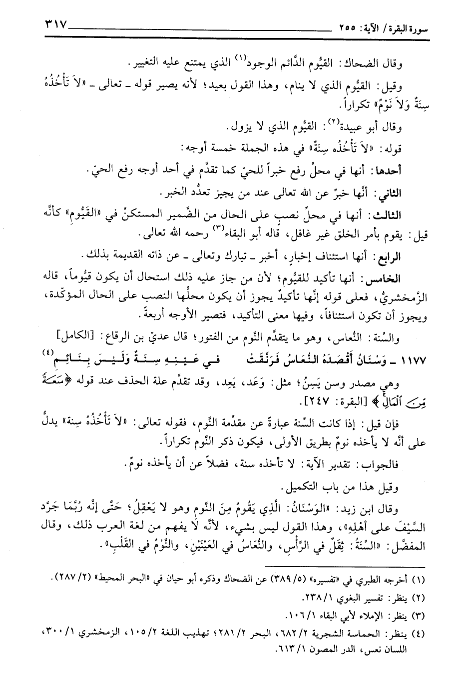 الخامس: أنها تأكيد للقيُّوم؛ لأن من جاز عليه ذلك استحال أن يكون قيُّوماً، قاله الزَّمخشريُّ، فعلى قوله إنَّها تأكيدٌ يجوز أن يكون محلُّها النصب على الحال المؤكَّدة، ويجوز أن تكون استئنافاً، وفيها معنى التأكيد، فتصير الأوجه أربعةً.