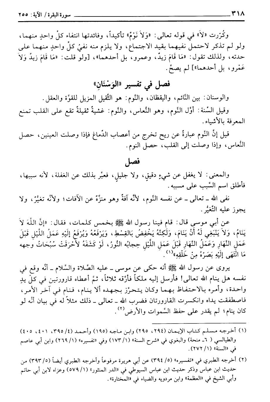 وكُرّرت «لاَ» في قوله تعالى: {وَلاَ نَوْمٌ} تأكيداً، وفائدتها انتفاء كلِّ واحدٍ منهما، ولو لم تذكر لاحتمل نفيهما بقيد الاجتماع، ولا يلزم منه نفيُ كلِّ واحدٍ منهما على حدته، ولذلك تقول: «مَا قَامَ زيدٌ، وعمرو، بل أحدهما» ، [ولو قلت: «مَا قَامَ زيدٌ وَلاَ عمْرو، بل أحدهما» ] لم يصحَّ.