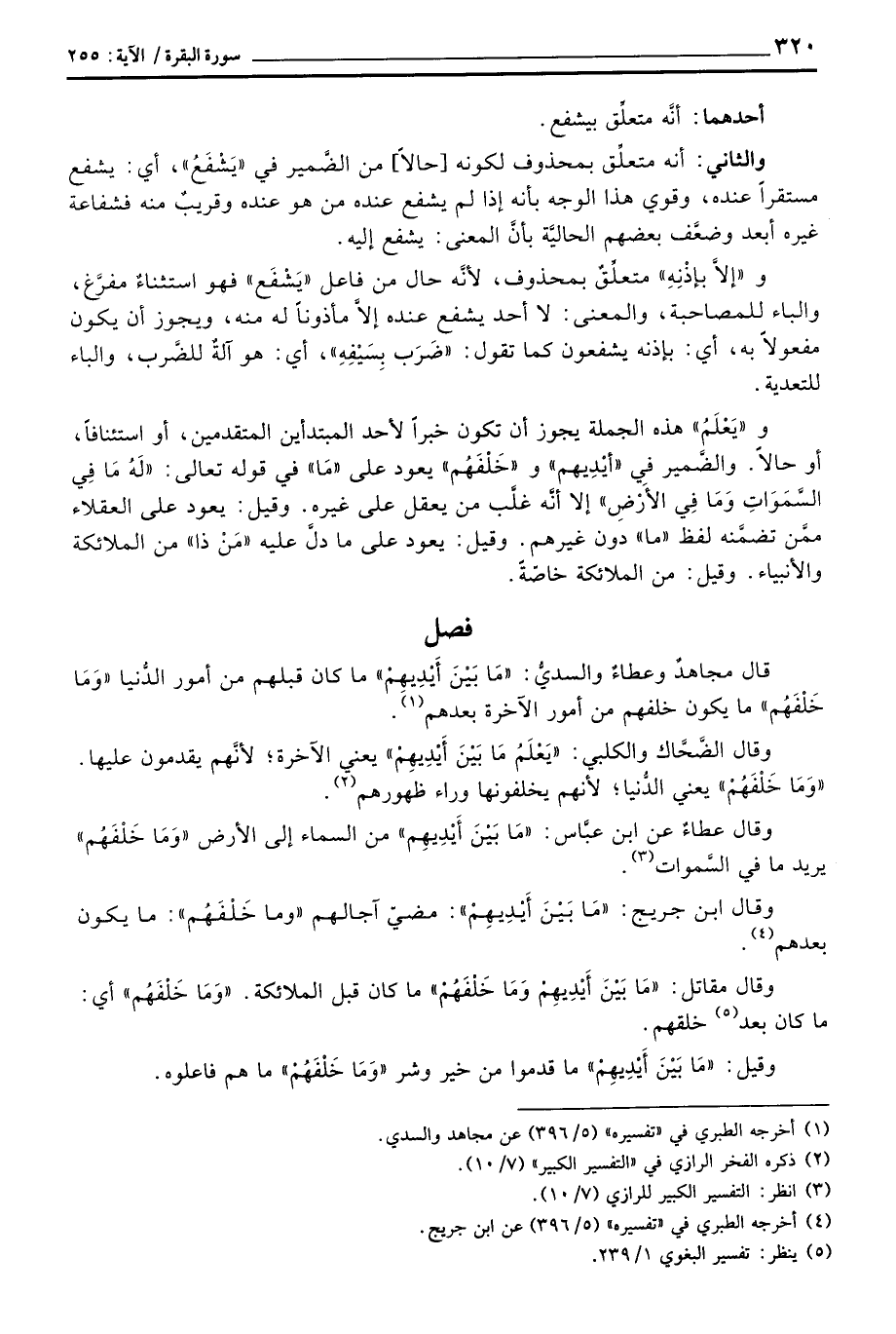 وقال الضَّحَّاك والكلبي: «يَعْلَمُ مَا بَيْنَ أَيْدِيهِمْ» يعني الآخرة؛ لأنَّهم يقدمون عليها. «وَمَا خَلفَهُمْ» يعني الدُّنيا؛ لأنهم يخلفونها وراء ظهورهم.