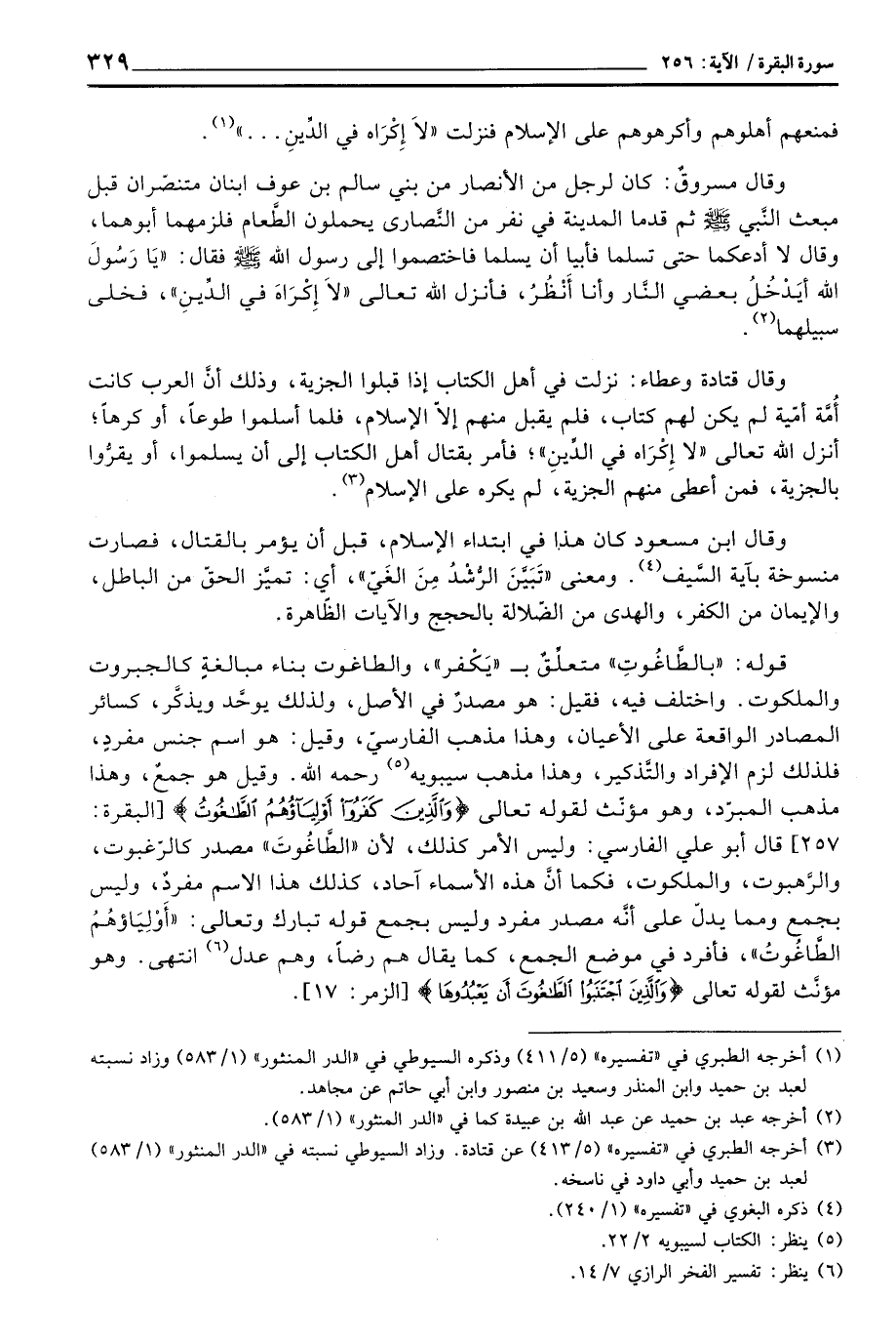 وقال ابن مسعود كان هذا في ابتداء الإسلام، قبل أن يؤمر بالقتال، فصارت منسوخة بآية السَّيف. ومعنى {تَّبَيَّنَ الرشد مِنَ الغي} ، أي: تميَّز الحقّ من الباطل، والإيمان من الكفر، والهدى من الضّلالة بالحجج والآيات الظَّاهرة.
