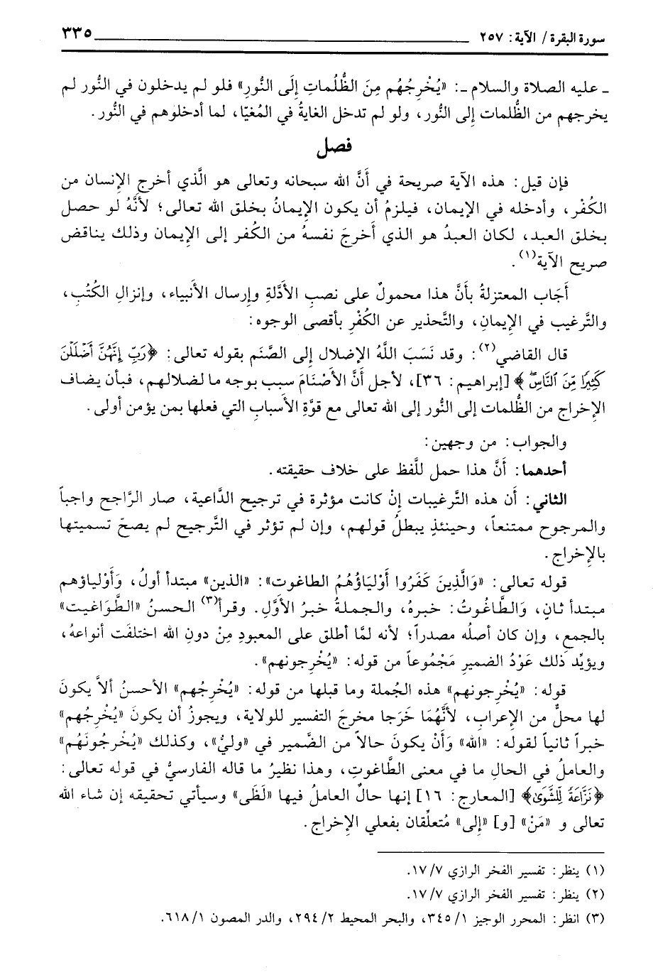فإن قيل: هذه الآية صريحة في أَنَّ الله سبحانه وتعالى هو الَّذي أخرج الإِنسان من الكُفْر، وأدخله في الإيمان، فيلزمُ أن يكون الإِيمانُ بخلق الله تعالى؛ لأَنَّهُ لو حصل بخلق العبد، لكان العبدُ هو الذي أخرجَ نفسهُ من الكُفر إلى الإِيمان وذلك يناقض صريح الآية.