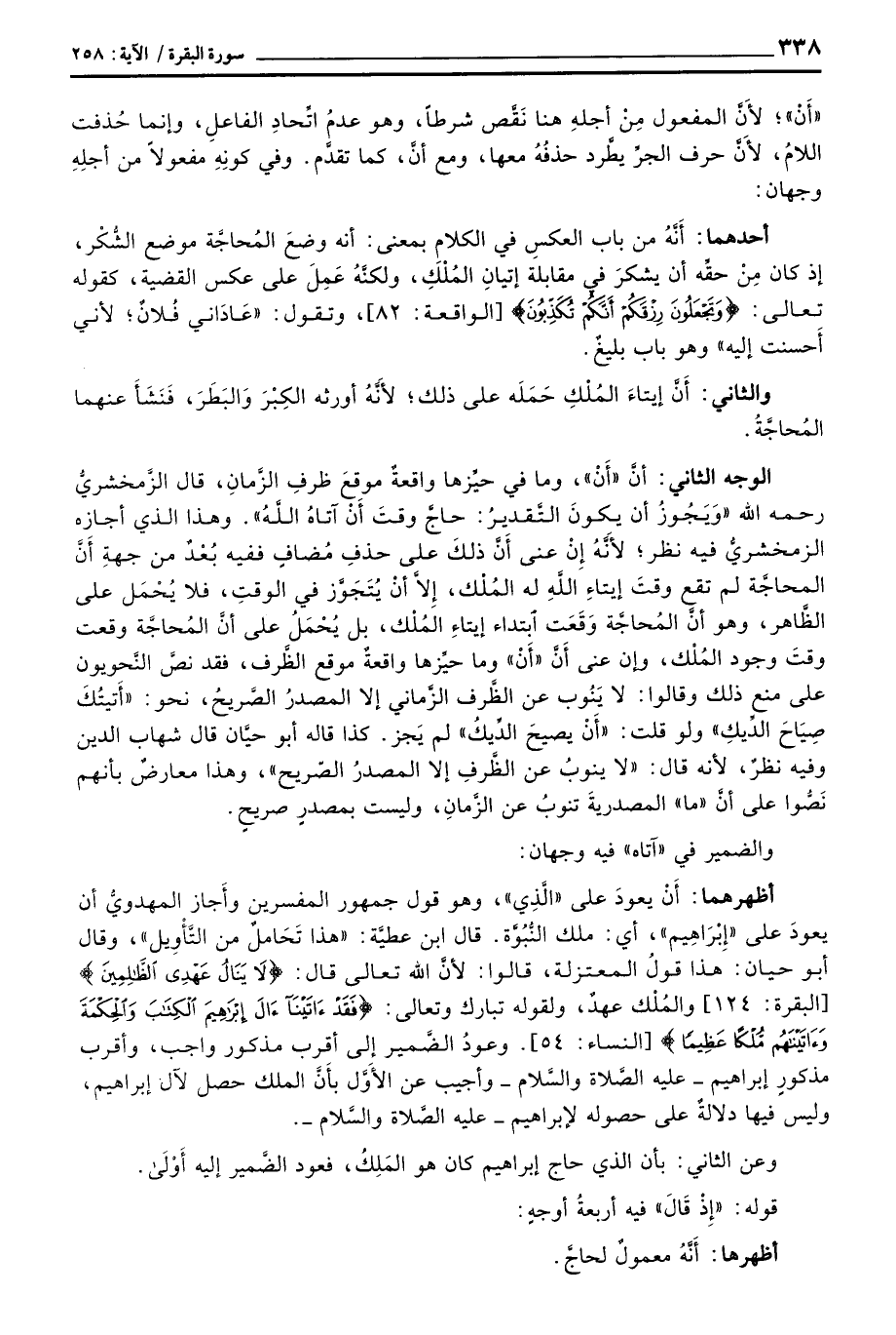 الوجه الثاني: أنَّ «أَنْ» ، وما في حيِّزها واقعةٌ موقعَ ظرفِ الزَّمانِ، قال الزَّمخشريُّ رَحِمَهُ اللَّهُ «وَيَجُوزُ أن يكونَ التَّقديرُ: حاجَّ وقتَ أَنْ آتاهُ اللهُ» . وهذا الذي أجازه الزمخشريُّ فيه نظر؛ لأَنَّهُ إِنْ عنى أَنَّ ذلكَ على حذفِ مُضافٍ ففيه بُعْدٌ من جهةِ أَنَّ المحاجَّة لم تقع وقتَ إِيتاءِ اللهِ له المُلْك، إِلاَّ أَنْ يُتَجَوَّز في الوقتِ، فلا يُحْمَل على الظَّاهر، وهو أنَّ المُحاجَّة وَقَعَت ابتداء إيتاءِ المُلْك، بل يُحْمَلُ على أنَّ المُحاجَّة وقعت وقتَ وجود المُلْك، وإن عنى أَنَّ «أَنْ» وما حيِّزها واقعةٌ موقع الظَّرف، فقد نصَّ النَّحويون على منع ذلك وقالوا: لا يَنُوب عن الظَّرف الزَّماني إلا المصدرُ الصَّريحُ، نحو: «أَتيتُكَ صِيَاحَ الدِّيكِ» ولو قلت: «أَنْ يصيحَ الدِّيكُ» لم يَجز. كذا قاله أبو حيَّان قال شهاب الدين وفيه نظرٌ، لأنه قال: «لا ينوبٌ عن الظَّرفِ إلا المصدرُ الصّريح» ، وهذا معارضٌ بأنهم نَصُّوا على أنَّ «ما» المصدريةَ تنوبُ عن الزَّمانِ، وليست بمصدرٍ صريحٍ.