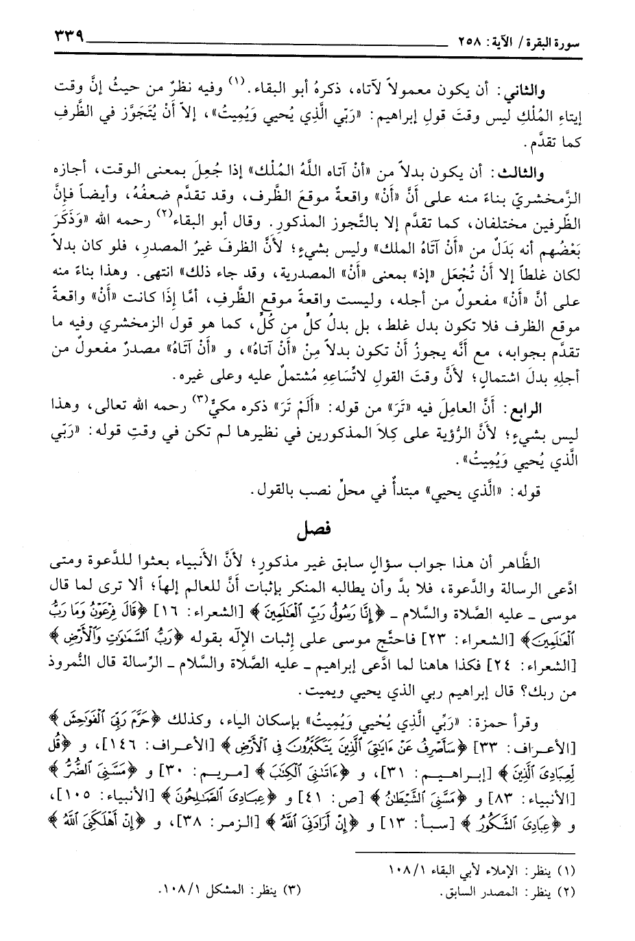 الرابع: أَنَّ العامِلَ فيه «تَرَ» منق وله: «أَلَمْ تَرَ» ذكره مكيٌّ رَحِمَهُ اللَّهُ تعالى، وهذا ليس بشيءٍ؛ لأَنَّ الرُّؤية على كِلاَ المذكورين في نظيرها لم تكن في وقتِ قوله: {رَبِّيَ الذي يُحْيِي وَيُمِيتُ} .