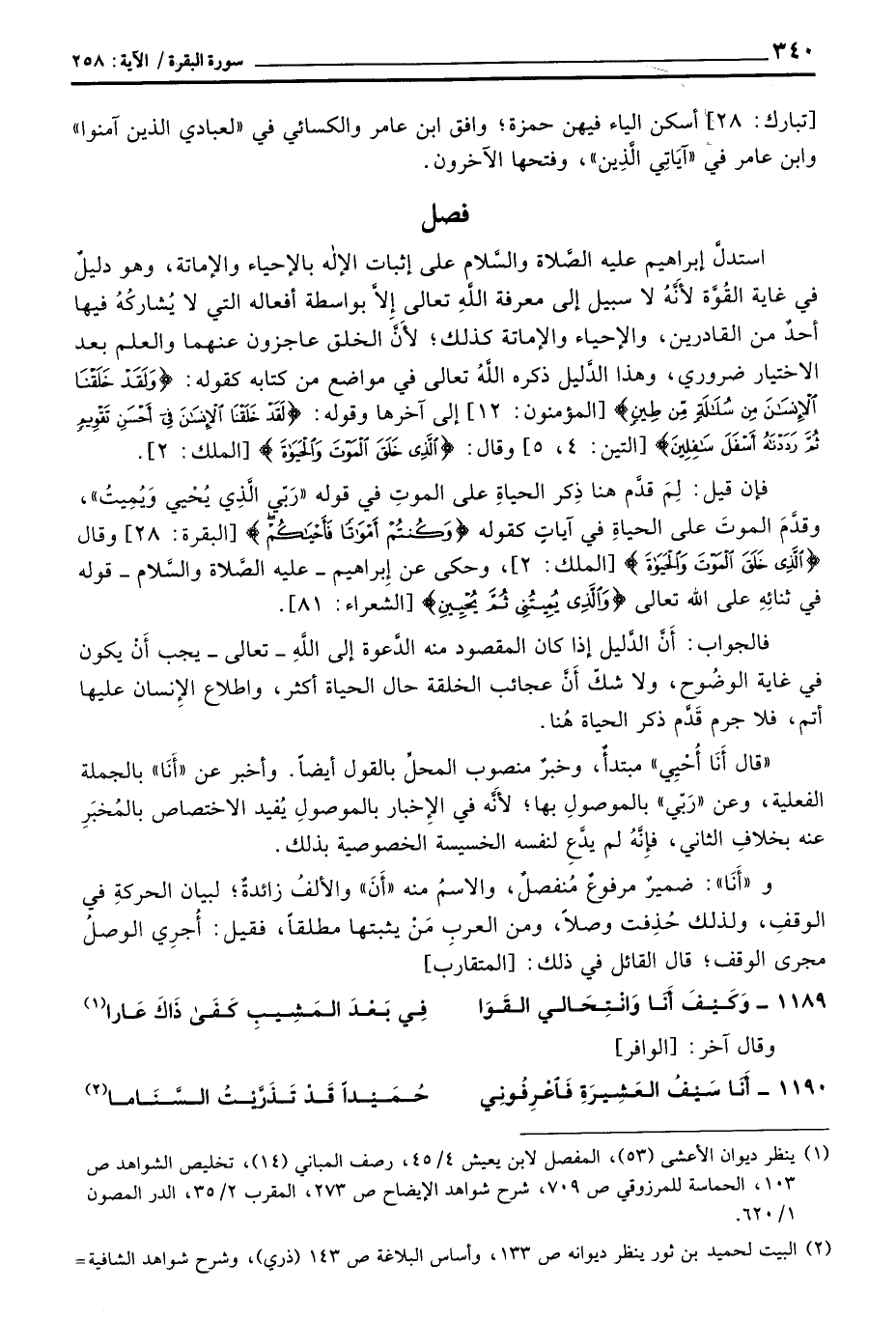 استدلَّ إبراهيم عليه الصَّلاة والسَّلام على إثبات الإله بالإحياء والإماتة، وهو دليلٌ في غاية القُوَّة لأَنَّهُ لا سبيل إلى معرفةِ اللهِ تعالى إِلاَّ بواسطة أفعاله التي لا يُشاركُهُ فيها أحدٌ من القادرين، والإحياء والإماتة كذلك؛ لأَنَّ الخلق عاجزون عنهما والعلم بعد الاختيار ضروري، وهذا الدَّليل ذكره اللهُ تعالى في مواضع من كتابه كقوله: {وَلَقَدْ خَلَقْنَا الإنسان مِن سُلاَلَةٍ مِّن طِينٍ} [المؤمنون: 12] إلى آخرها وقوله: {لَقَدْ خَلَقْنَا الإنسان في أَحْسَنِ تَقْوِيمٍ ثُمَّ رَدَدْنَاهُ أَسْفَلَ سَافِلِينَ} [التين: 4، 5] وقال: {الذي خَلَقَ الموت والحياة}