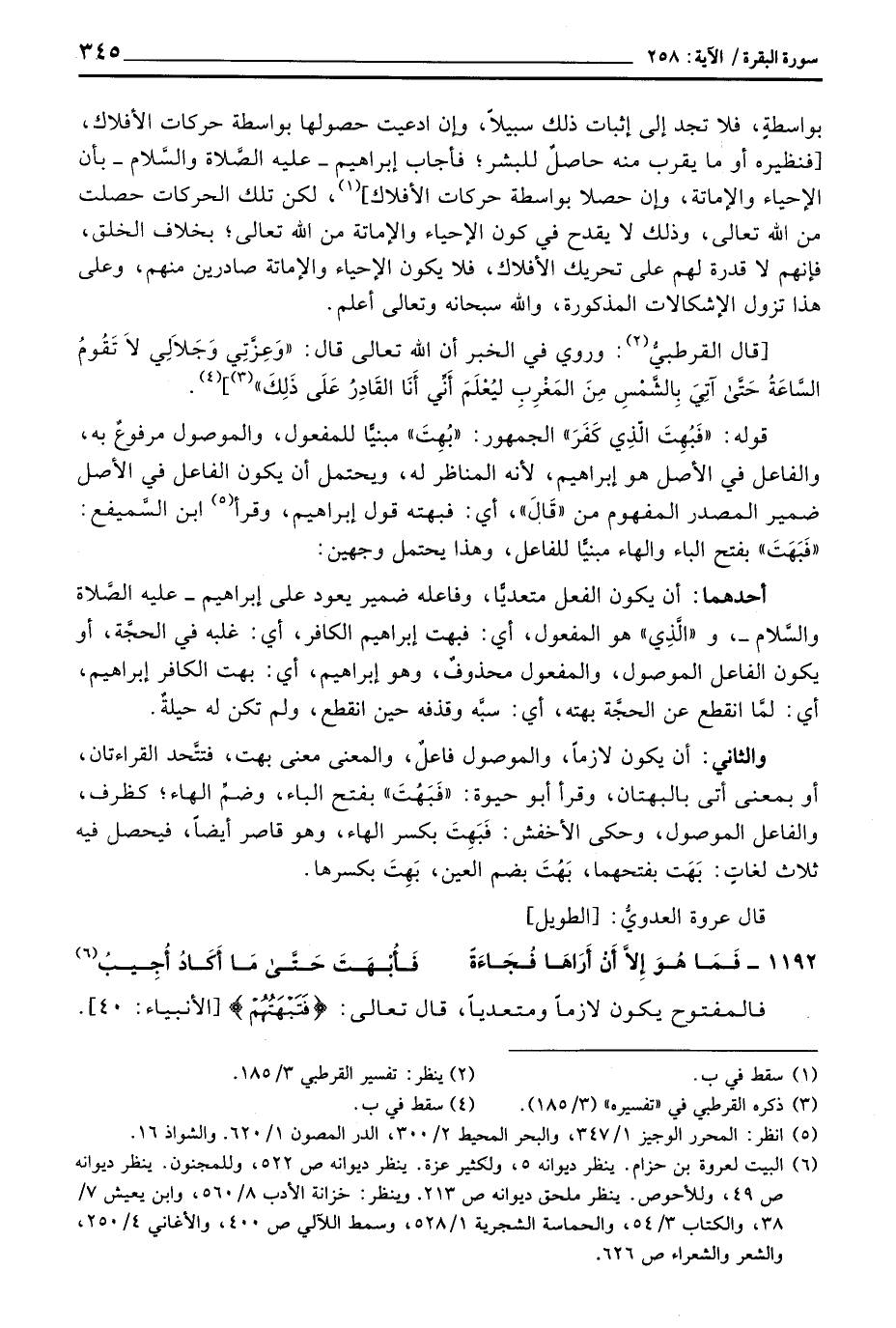 » ] «قوله: {فَبُهِتَ الذي كَفَرَ} الجمهور:» بُهِتَ «مبنيّاً للمفعول، والموصول مرفوعٌ به، والفاعل في الأصل هو إبراهيم، لأنه المناظر له، ويحتمل أن يكون الفالع في الأصل ضمير المصدر المفهوم من» قَالَ «، أي: فبهته قول إبراهيم، وقرأ ابن السَّميفع:» فَبَهَتَ «بفتح الباء والهاء مبنيّاً للفاعل، وهذا يحتمل وجهين: