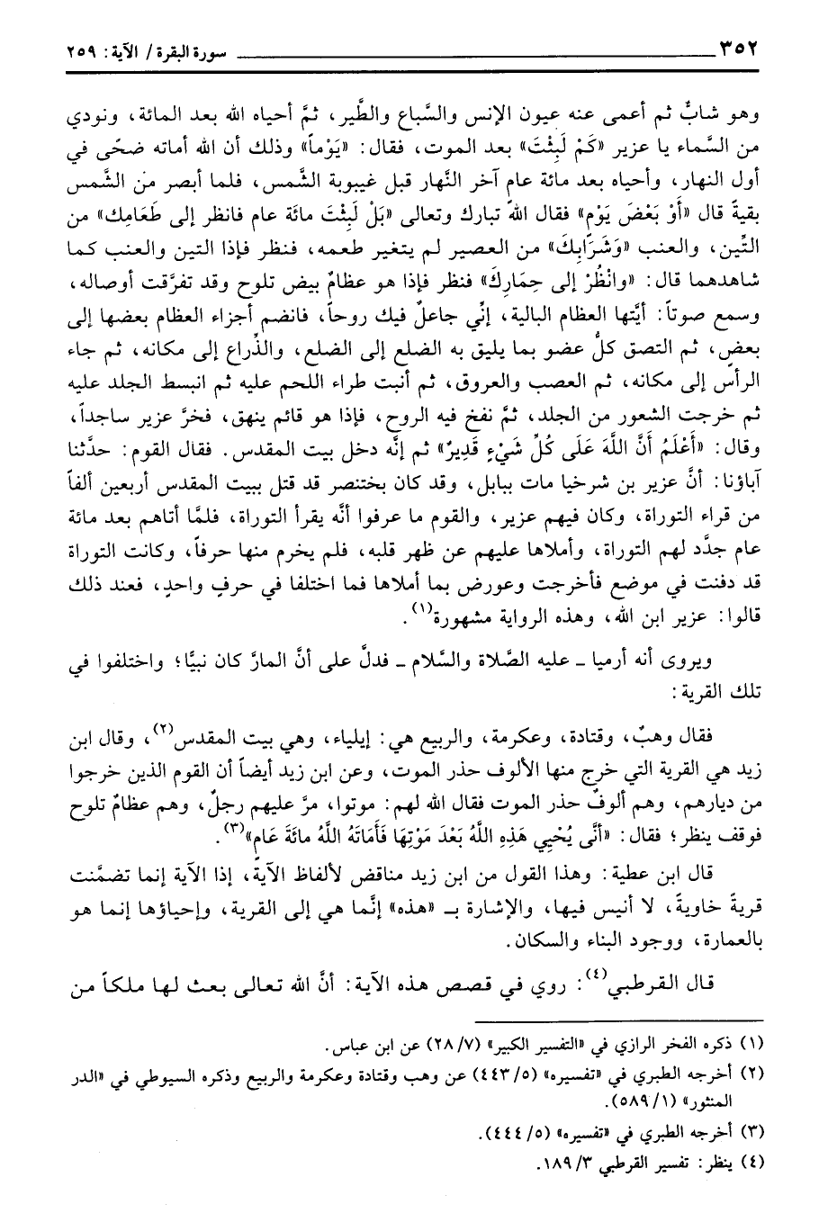 وهو شابٌّ ثم أعمى عنه عيون الإنس والسِّباع والطَّير، ثمَّ أحياه الله بعد المائة، ونودي من السَّماء يا عزير «كَمْ لَبِثْتَ» بعد الموت، فقال: «يَوْماً» وذلك أن الله أماته ضحًى في أول النهار، وأحياه بعد مائة عامٍ آخر النَّهار قبل غيبوبة الشَّمس، فلما أبصر من الشَّمس بقيةً قال: «أَوْ بَعْضَ يَوْمٍ» فقال الله تبارك وتعالى: {بَل لَّبِثْتَ مِئَةَ عَامٍ فانظر إلى طَعَامِكَ} من التِّين، والعنب «وَشَرَابِكَ» من العصير لم يتغير طعمه، فنظر فإذا التين والعنب كما شاهدهما قال: «وَانْظُرْ إِلَى حِمَارِكَ» فنظر فإذا هو عظامٌ بيض تلوح وقد تفرَّقت أوصاله، وسمع صوتاً: أيَّتها العظام البالية، إنِّي جاعلٌ فيك روحاً، فانضم أجزاء العظام بعضها إلى بعضٍ، ثم التصق كلُّ عضو بما يليق به الضلع إلى الضلع، والذِّراع إلى مكانه، ثم جاء الرأس إلى مكانه، ثم العصب والعروق، ثم أنبت طراء اللحم عليه ثم انبسط الجلد عليه ثم خرجت الشعور من الجلد، ثمَّ نفخ فيه الروح، فإذا هو قائم ينهق، فخرَّ عزير ساجداً، وقال: {أَعْلَمُ أَنَّ الله على كُلِّ شَيْءٍ قَدِيرٌ} ثم إنَّه دخل بيت المقدس.