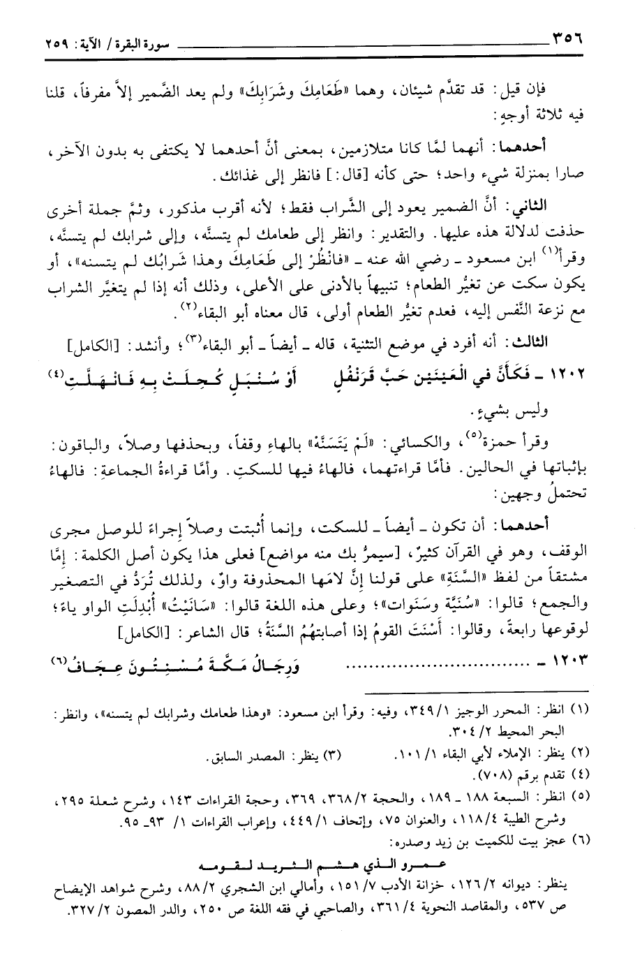 الثاني: أنَّ الضمير يعود إلى الشَّراب فقط؛ لأنه أقرب مذكور، وثمَّ جملة أخرى حذفت لدلالة هذه عليها. والتقدير: وانظر إلى طعامك لم يتسنَّه، وإلى شرابك لم يتسنَّه، وقرأ ابن مسعود - رَضِيَ اللَّهُ عَنْه - «فانْظُرْ إِلى طَعَامِكَ وهذا شَرابُك لم يتسنه» ، أو يكون سكت عن تغيُّر الطعام؛ تنبيهاً بالأدنى على الأعلى، وذلك أنه إذا لم يتغيَّر الشراب مع نزعة النَّفس إليه، فعدم تغيُّر الطعام أولى، قال معناه أبو البقاء.