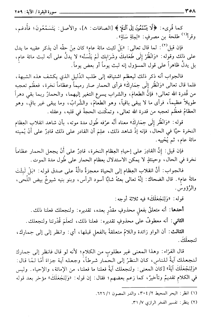 قال الفرَّاء: وهذا المعنى غير مطلوبٍ من الكلامِ؛ لأنه لو قال فانظر إلى حِمارك لنجعلك آيةً للناسِ، كان النظرُ إلى الحمار شرطاً، وجعله آية جزاءً أَمَّا لمَّا قال: «وَلِنَجْعَلَكَ آيَةً» [كان المعنى: ولنجعلك آيةً فعلنا ما فعلنا، من الإماتة، والإحياء. وليس في الكلامِ تقديمٌ وتأخيرٌ، كما زعم بعضهم؛ فقال: إن قوله: «وَلِنَجْعَلَكَ» مؤخر بعد قوله