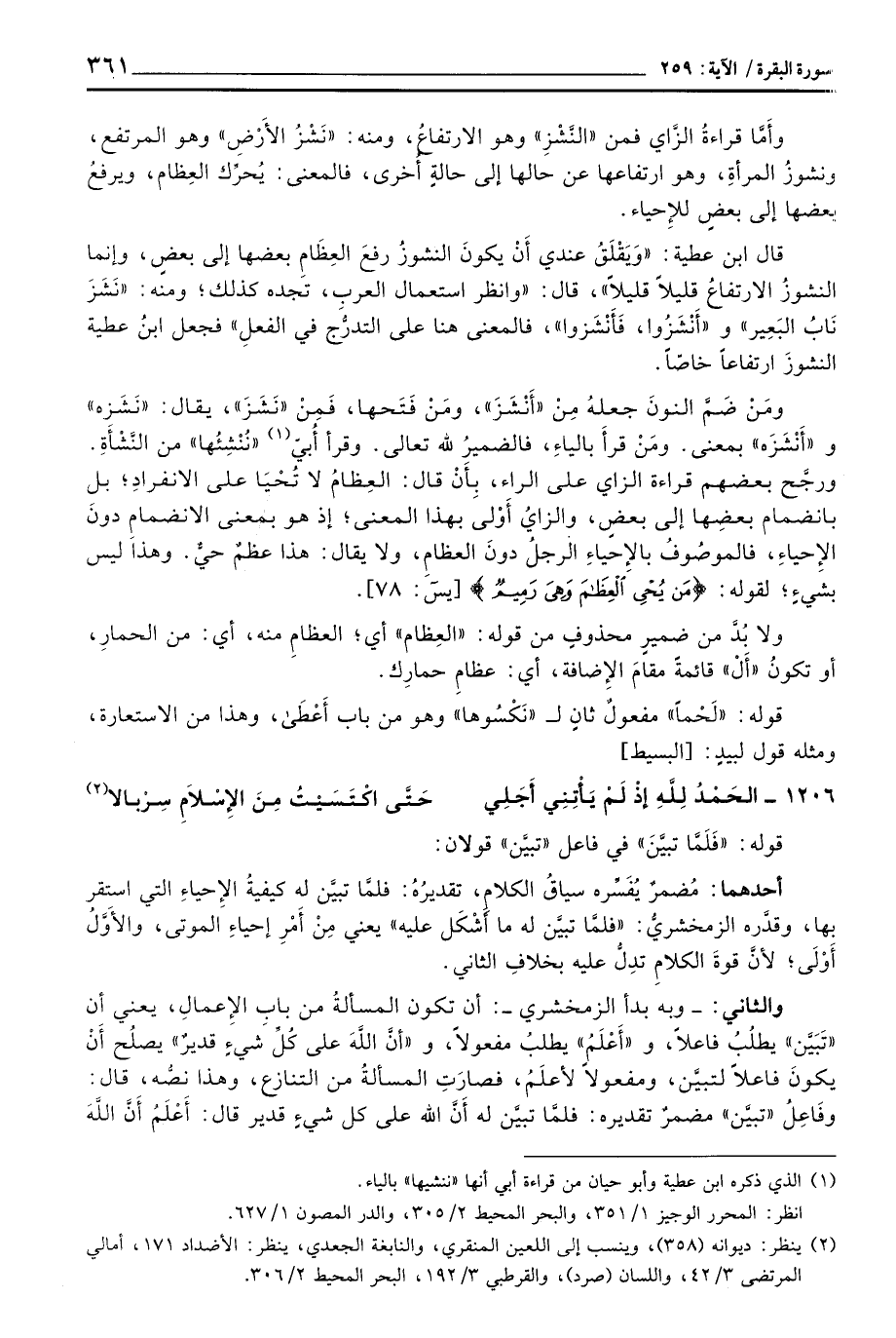 أحدهما: مُضمرٌ يُفَسِّره سياقُ الكلامِ، تقديرُهُ: فلمَّا تبيَّن له كيفيةُ الإِحياءِ التي استقر بها، وقدَّره الزمخشريُّ: «فلمَّا تبيَّن له ما أَشْكَل عليه» يعني مِنْ أَمْرِ إِحياءِ الموتى، والأَوَّلُ أَوْلَى؛ لأنَّ قوةَ الكلامِ تدِلُّ عليه بخلافِ الثاني.