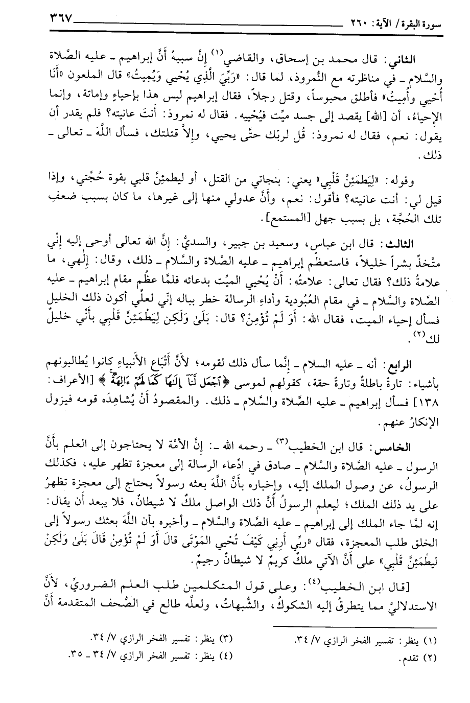 الخامس: قال ابن الخطيب - رَحِمَهُ اللَّهُ -: إِنَّ الأمَّة لا يحتاجون إلى العلم بأَنَّ الرسول - عليه الصَّلاة والسَّلام - صادق في ادِّعاء الرسالة إلى معجزة تظهر عليه، فكذلك الرسولُ، عن وصول الملك إليه، وإِخباره بأَنَّ اللهَ بعثه رسولاً يحتاج إلى معجزة تظهرُ على يد ذلك الملك؛ ليعلم الرسولُ أَنَّ ذلك الواصل ملكٌ لا شيطانٌ، فلا يبعد أَن يقال: إنه لمَّا جاء الملك إلى إبراهيم - عليه الصَّلاة والسَّلام - وأخبره بأن اللهَ بعثك رسولاً إلى الخلق طلب المعجزة، فقال {رَبِّ أَرِنِي كَيْفَ تُحْيِي الموتى قَالَ أَوَلَمْ تُؤْمِن قَالَ بلى وَلَكِن لِّيَطْمَئِنَّ قَلْبِي} على أَنَّ الآتي ملكٌ كريمٌ لا شيطانٌ رجيمٌ.