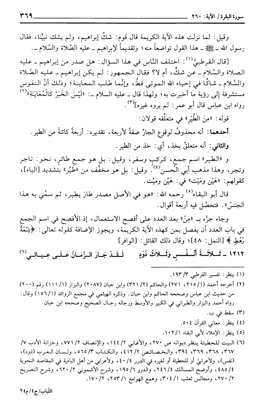 [قال القرطبيُّ: اختلف النَّاس في هذا السؤال: هل صدر من إبراهيم - عليه الصلاة والسَّلام - عن شكٍّ، أم لا؟ فقال الجمهور: لم يكن إبراهيم - عليه الصَّلاة والسَّلام - شاكّاً في إحياء الله الموتى قطُّ، وإنَّما طلب المعاينة؛ وذلك أنَّ النفوس مستشرفة إلى رؤية ما أخبرت به؛ ولهذا قال - عليه السلام -: «لَيْسَ الخَبَرُ كَالْمُعَايَنَةِ» رواه ابن عباس قال أبو عمر: لم يروه غيره] .