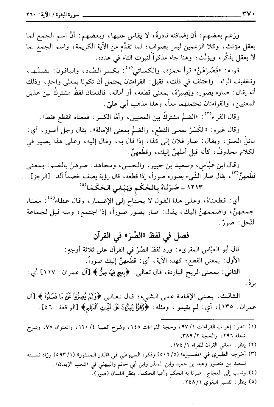 1213 - صُرْنَاهُ بِالحُكْمِ وَيَبْغِي الحَكَمَا ... أي: قطعناهُ، وعلى هذا القول لا يحتاج إلى الإضمار، وقال عطاء: معناه اجمعهنَّ، واضممهنَّ إليك، يقال: صار يصور صوراً، إذا اجتمع، ومنه قيل لجماعة النَّحل: صورٌ.