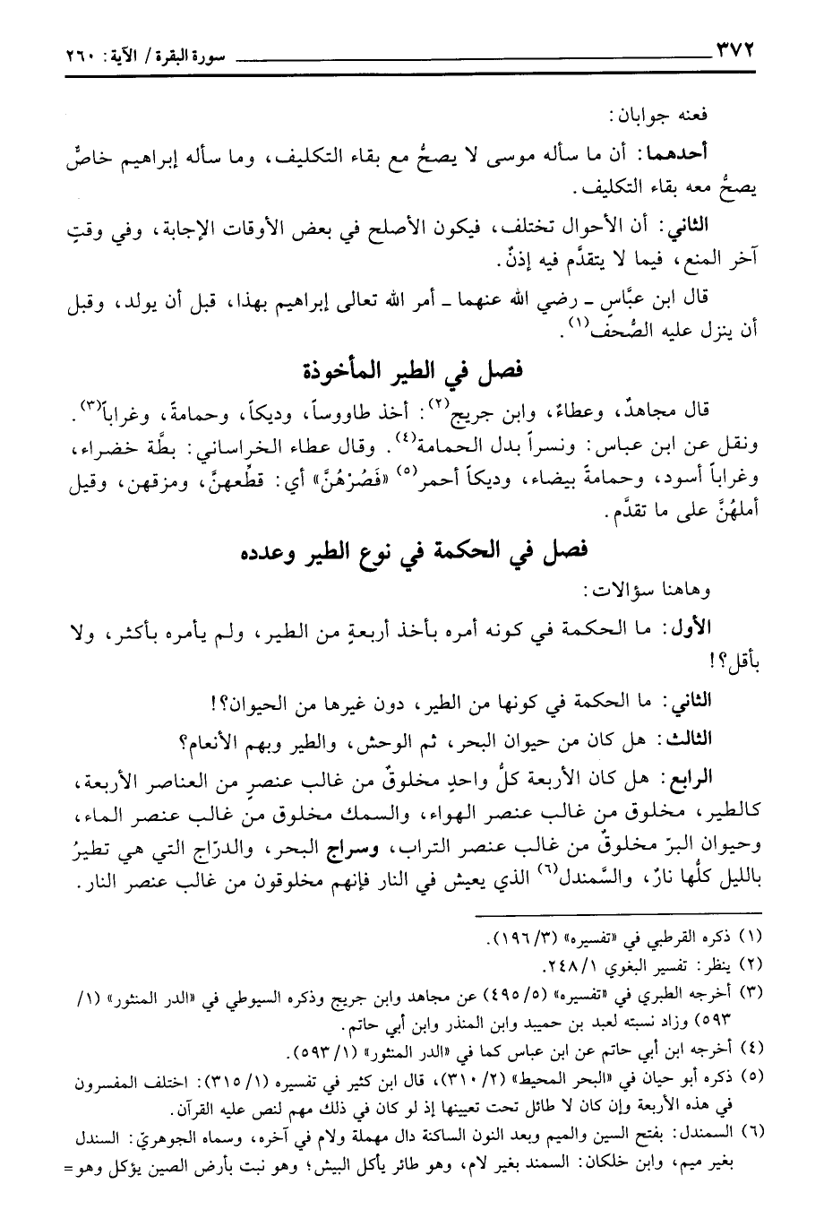 قال مجاهدٌ، وعطاءٌ، وابن جريج: أخذ طاووساً، وديكاً، وحمامةً، وغراباً. ونقل عن ابن عباس: ونسراً بدل الحمامة. وقال عطاء الخراساني: بطَّة خضراء، وغراباً أسود، وحمامةً بيضاء، وديكاً أحمر «فَصُرْهُنَّ» أي: قطِّعهنَّ، ومزقهن، وقيل أملهُنَّ على ما تقدَّم.