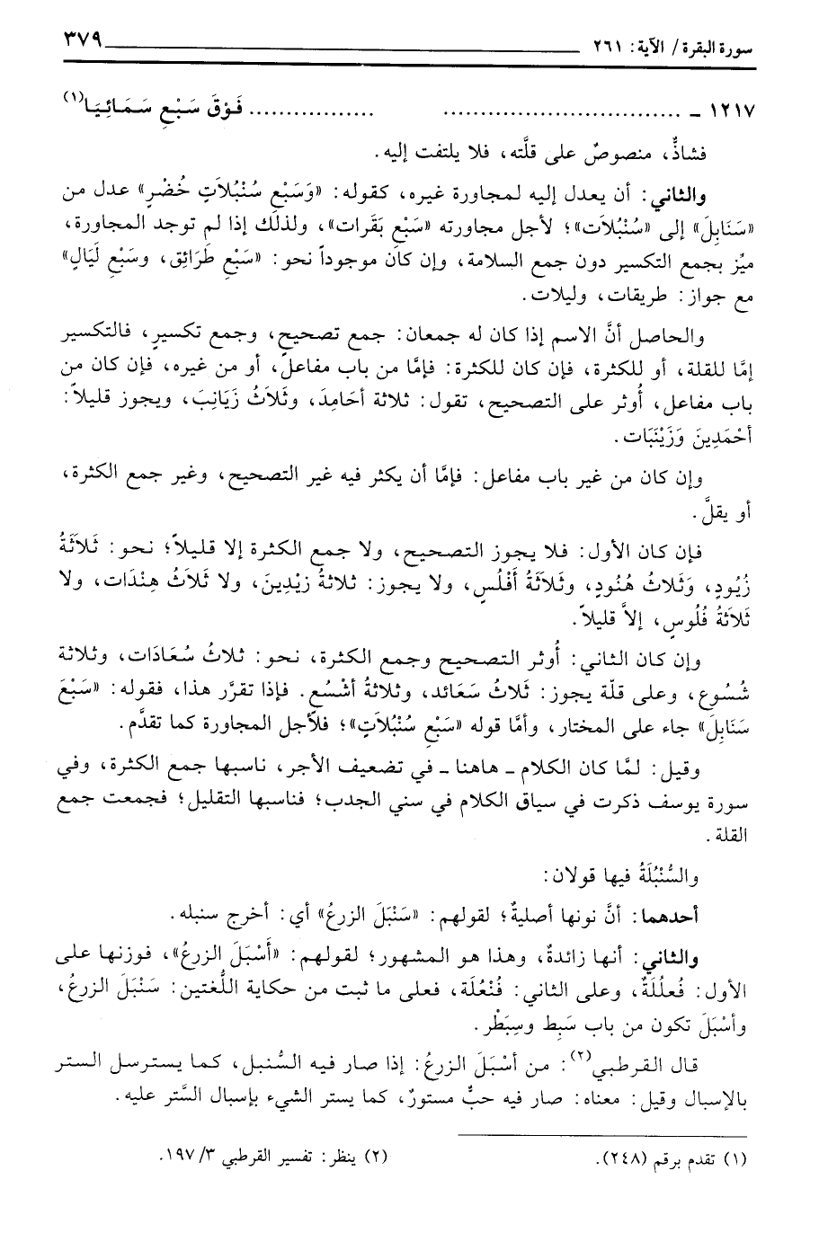 وإن كان الثاني: أُوثر التصحيح وجمع الكثرة، نحو: ثلاثُ سُعَادَات، وثلاثة شُسُوع، وعلى قلّة يجوز: ثَلاثُ سَعَائد، وثلاثةُ أشْسُع. فإذا تقرَّر هذا، فقوله: «سَبْعَ سَنَابِلَ» جاء على المختار، وأمَّا قوله «سَبْعِ سُنْبُلاَتٍ» ؛ فلأجل المجاورة كما تقدَّم.