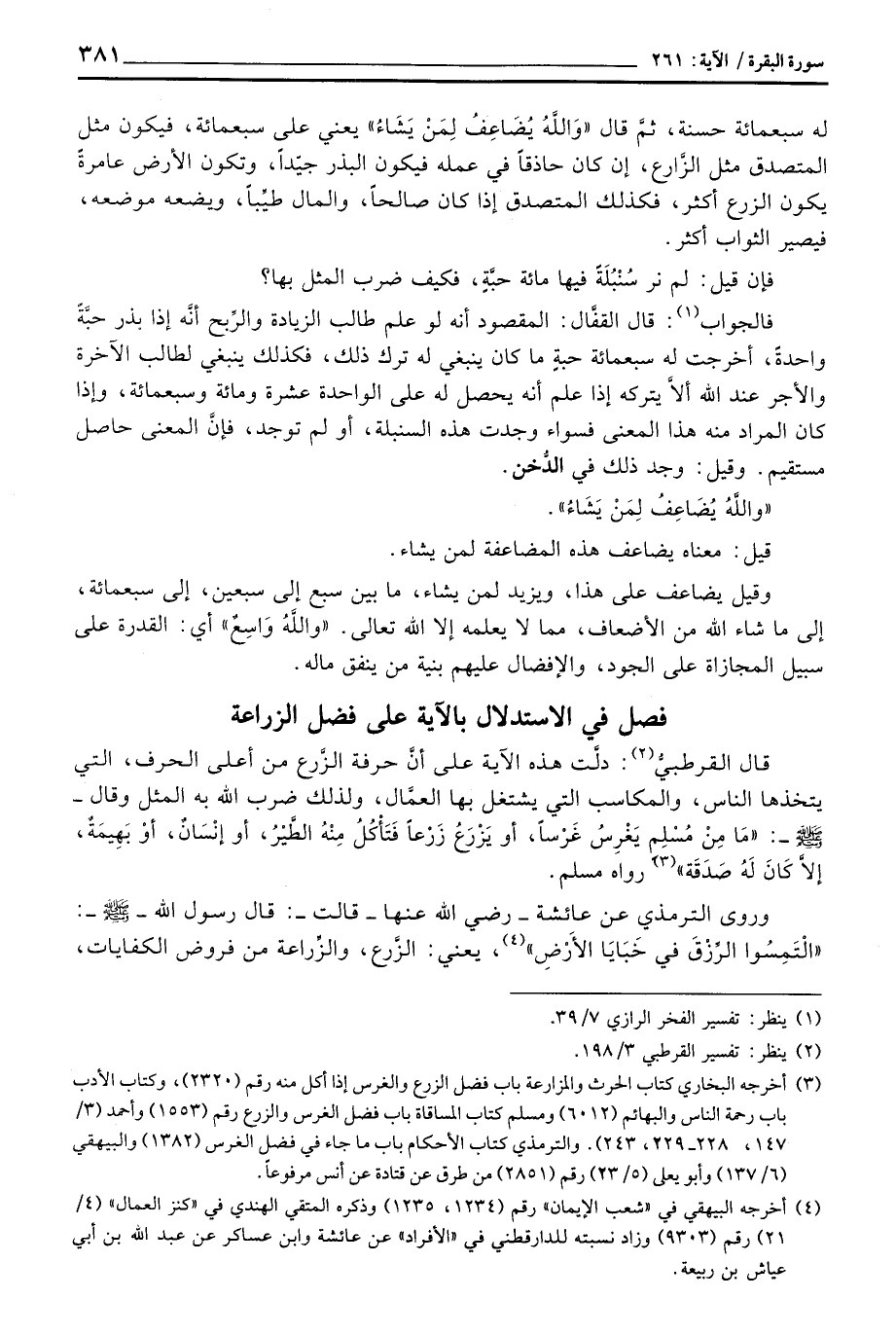 قال القرطبيُّ: دلَّت هذه الآية على أنَّ حرفة الزَّرع من أعلى الحرف، التي يتخذها الناس، والمكاسب التي يشتغل بها العمَّال، ولذلك ضرب الله به المثل وقال - صَلَّى اللَّهُ عَلَيْهِ وَسَلَّم َ -: «مَا مِنْ مُسْلِمٍ يَغْرِسُ غَرْساً، أو يَزْرَعُ زَرْعاً فَتأَكْلُ مِنْهُ الطَّيْرُ، أو إِنْسَانٌ، أوْ بَهِيمَةٌ، إِلاَّ كَانَ لَهُ صَدَقَة» رواه مسلم.