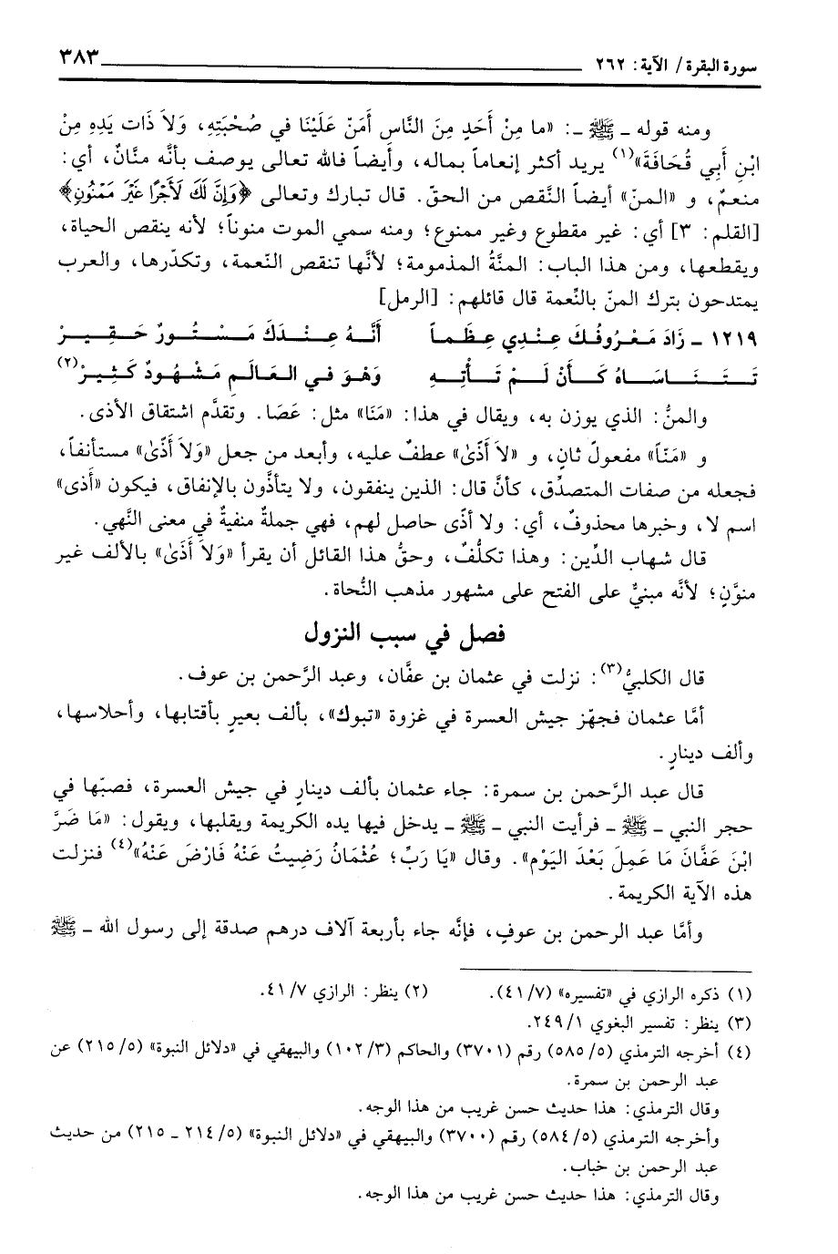 ومنه قوله - صَلَّى اللَّهُ عَلَيْهِ وَسَلَّم َ -: «ما مِنْ أَحَدٍ مِنَ النَّاسِ أَمَنَّ عَلَيْنَا في صُحْبَتِهِ، وَلاَ ذَات يَدِهِ مِنْ ابْنِ أَبِي قُحَافَةَ» يريد أكثر إنعاماً بماله، وأيضاً فالله تعالى يوصف بأنَّه منَّانٌ، أي: منعمٌ، و «المنّ» أيضاً النَّقص من الحقّ. قال تبارك وتعالى: {وَإِنَّ لَكَ لأَجْراً غَيْرَ مَمْنُونٍ} [القلم: 3] أي: غير مقطوع وغير ممنوع؛ ومنه سمي الموت منوناص؛ لأنه ينقص الحياة، ويقطعها، ومن هذا الباب: المنَّةُ المذمومة؛ لأنَّها تنقص النّعمة، وتكدّرها، والعرب يمتدحون بترك المنّ بالنِّعمة قال قائلهم: [الرمل]