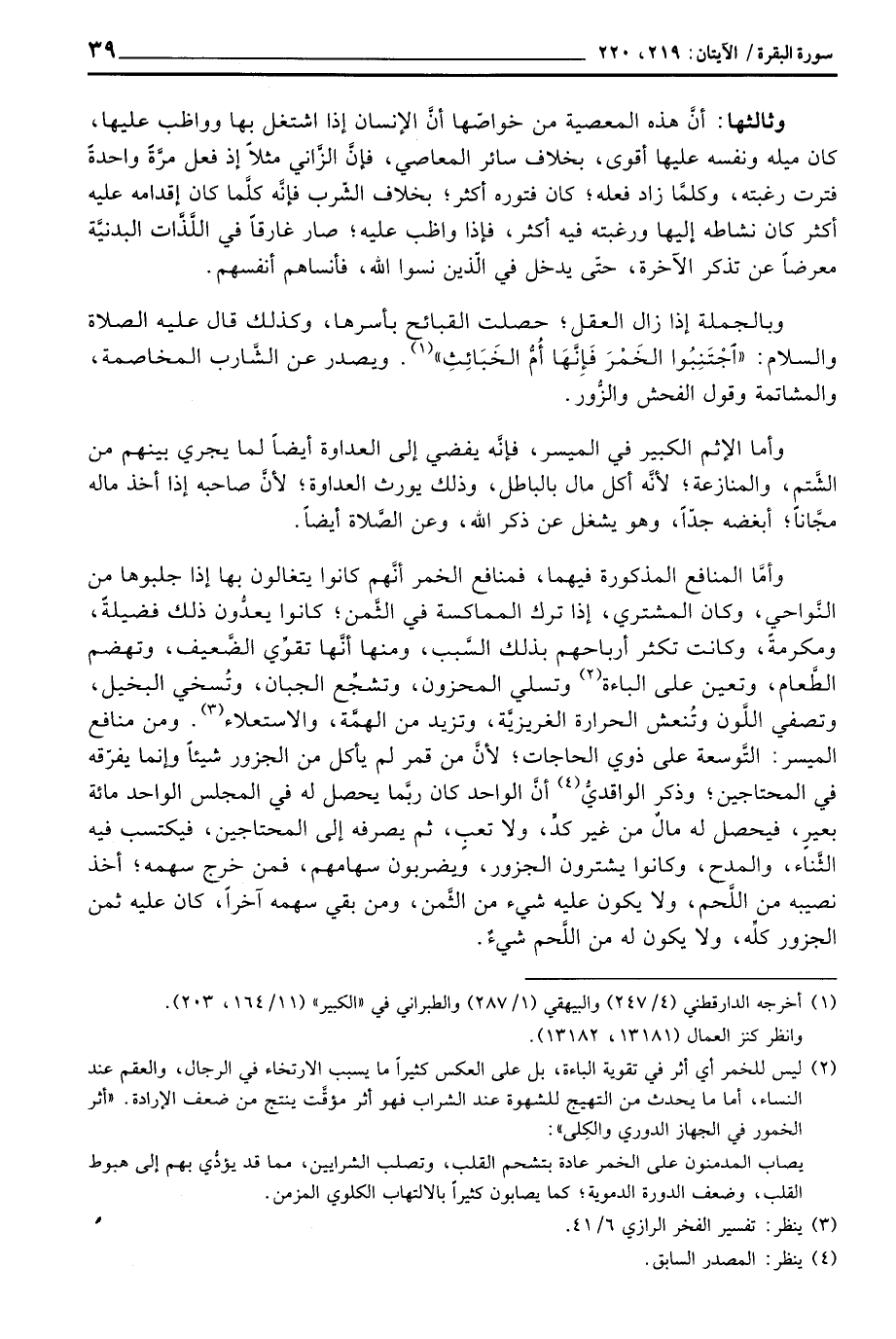 وأمَّا المنافع المذكورة فيهما، فمنافع الخمر أنَّهم كانوا يتغالون بها إذا جلبوها من النَّواحي، وكان المشتري، إذا ترك المماكسة في الثَّمن؛ كانوا يعدُّون ذلك فضيلةً، ومكرمةً، وكانت تكثر أرباحهم بذلك السَّبب، ومنها أنَّها تقوِّي الضَّعيف، وتهضم الطَّعام، وتعين على الباءة وتسلي المحزون، وتشجِّع الجبان، وتُسخي البخيل، وتصفي اللَّون وتُنعش الحرارة الغريزيَّة، وتزيد من الهمَّة، والاستعلاء. ومن منافع الميسر: التَّوسعة على ذوي الحاجات؛ لأنَّ من قمر لم يأكل من الجزور شيئاً وإنما يفرّقه في المحتاجين؛ وذكر الواقديُّ أنَّ الواحد كان ربَّما يحصل له في المجلس الواحد مائة بعيرٍ، فيحصل له مالٌ من غير كدٍّ، ولا تعبٍ، ثم يصرفه إلى المحتاجين، فيكتسب فيه الثَّناء، والمدح، وكانوا يشترون الجزور، ويضربون سهامهم، فمن خرج سهمه؛ أخذ نصيبه من اللَّحم، ولا يكون عليه شيء من الثَّمن، ومن بقي سهمه آخراً، كان عليه ثمن الجزور كلِّه، ولا يكون له من اللَّحم شيءٌ.