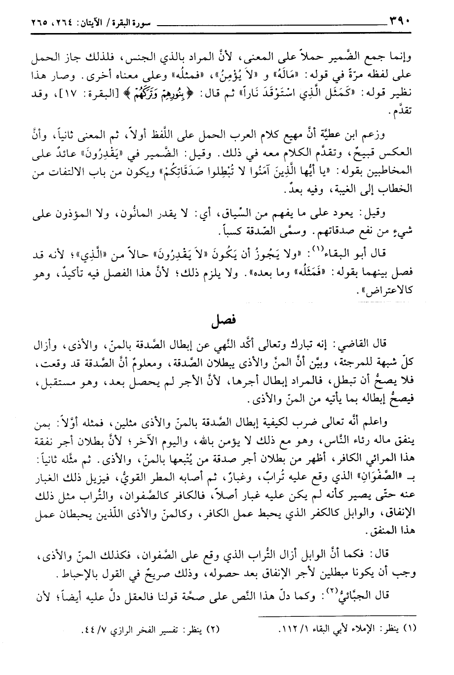 قال القاضي: إنه تبارك وتعالى أكَّد النَّهي عن إبطال الصَّدقة بالمنّ، والأذى، وأزال كلّ شبهة للمرجئة، وبيَّن أنَّ المنَّ والأذى يبطلان الصَّدقة، ومعلومٌ أنَّ الصَّدقة قد وقعت، فلا يصحُّ أن تبطل، فالمراد إبطال أجرها، لأنَّ الأجر لم يحصل بعد، وهو مستقبل، فيصحُّ إبطاله بما يأتيه من المنّ والأذى.
