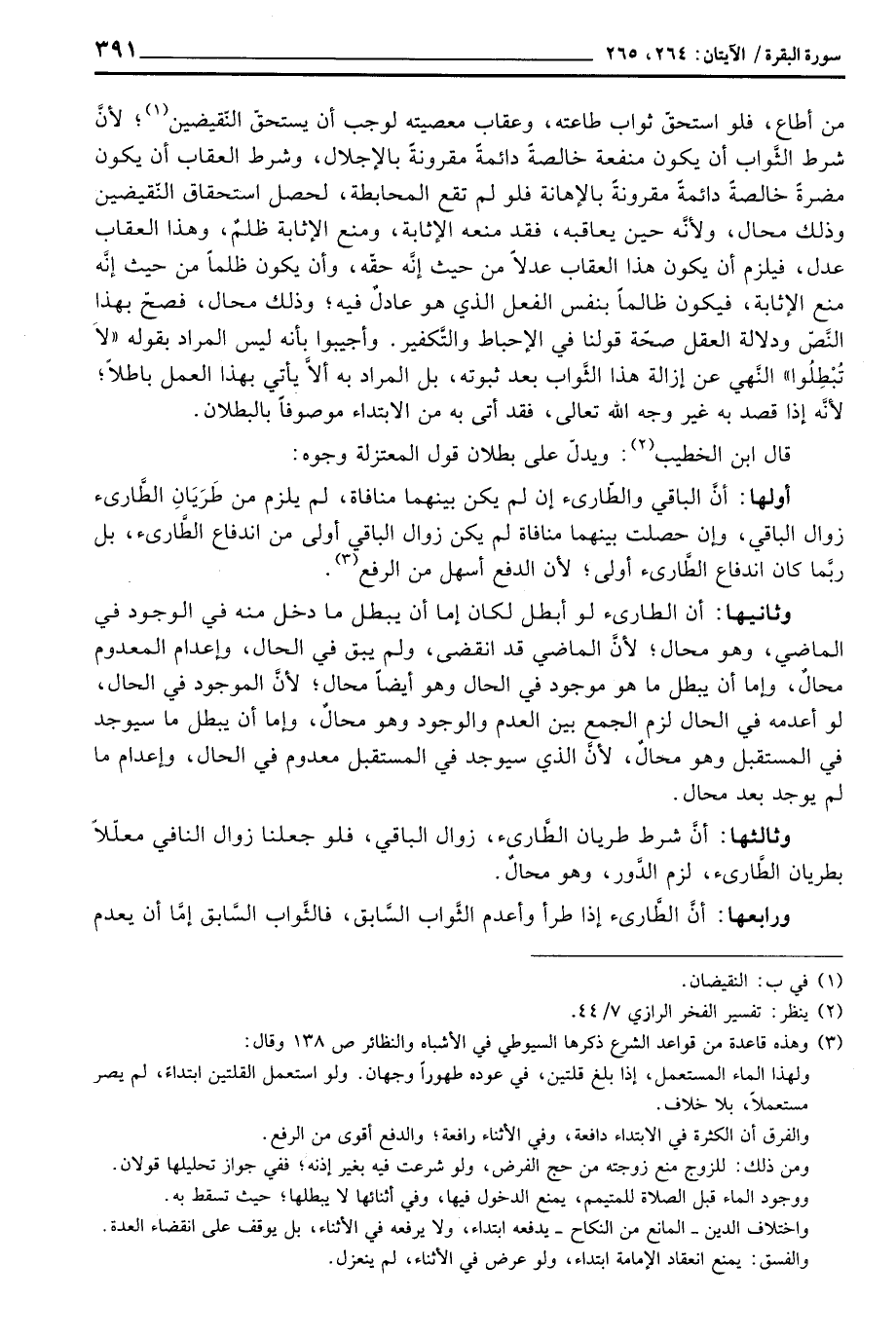 وثانيها: أن الطارئ لو أبطل لكان إما أن يبطل ما دخل منه في الوجود في الماضي، وهو محال؛ لأنَّ الماضي قد انقضى، ولم يبق في الحال، وإعدام المعدوم محالٌ، وإما أن يبطل ما هو موجود في الحال وهو أيضاً محال؛ لأنَّ الموجود في الحال، لو أعدمه في الحال لزم الجمع بين العدم والوجود وهو محالٌ، وإما أن يبطل ما سيوجد في المستقبل وهو محالٌ، لأنَّ الذي سيوجد في المستقبل معدوم في الحال، وإعدام ما لم يوجد بعد محال.