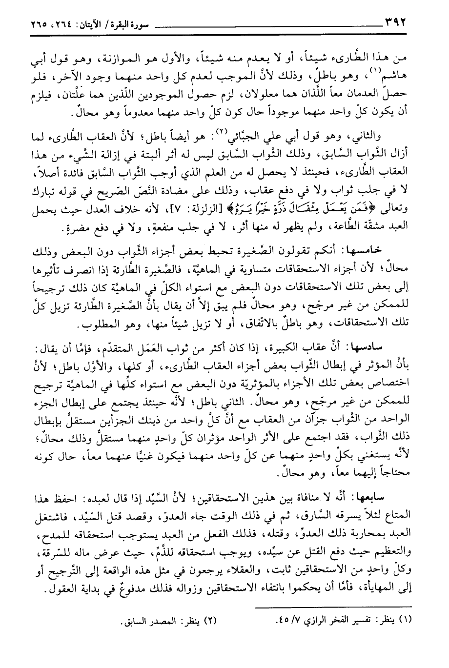 والثاني، وهو قول أبي علي الجبَّائي: هو أيضاً باطل؛ لأنَّ العقاب الطَّارئ لما أزال الثَّواب السَّابق، وذلك الثَّواب السَّابق ليس له أثر ألبتة في إزالة الشَّيء من هذا العقاب الطَّارئ؛ فحينئذ لا يحصل له من العلم الذي أوجب الثَّواب السَّابق فائدة أصلاً، لا في جلب ثواب ولا في دفع عقاب، وذلك على مضادة النَّصّ الصّريح في قوله تبارك وتعالى {فَمَن يَعْمَلْ مِثْقَالَ ذَرَّةٍ خَيْراً يَرَهُ} [الزلزلة: 7] ، لأنه خلاف العدل حيث يحمل العبد مشقّة الطَّاعة، ولم يظهر له منها أثر، لا في جلب منفعةٍ، ولا في دفع مضرةٍ.