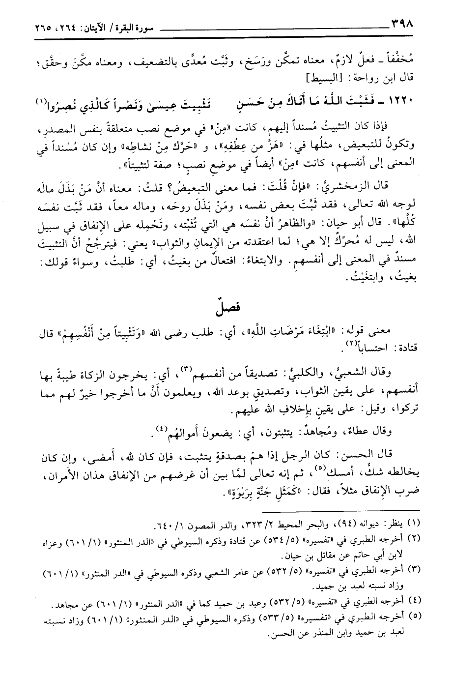 قال الزمخشري: " فإن قلت: فما معنى التبعيض؟ قلت: معناه أن من بذل ماله لوجه الله تعالى، فقد ثبت بعض نفسه، ومن بذل روحه، وماله معا، فقد ثبت نفسه كلها ". قال أبو حيان: " والظاهر أن نفسه هي التي تثبته، وتحمله على الإنفاق في سبيل الله، ليس له محرك إلا هي؛ لما اعتقدته من الإيمان والثواب " يعني: فيترجح أن التثبيت مسند في المعنى إلى أنفسهم. والابتغاء: افتعال من بغيت، أي: طلبت، وسواء قولك: بغيت، وابتغيت.