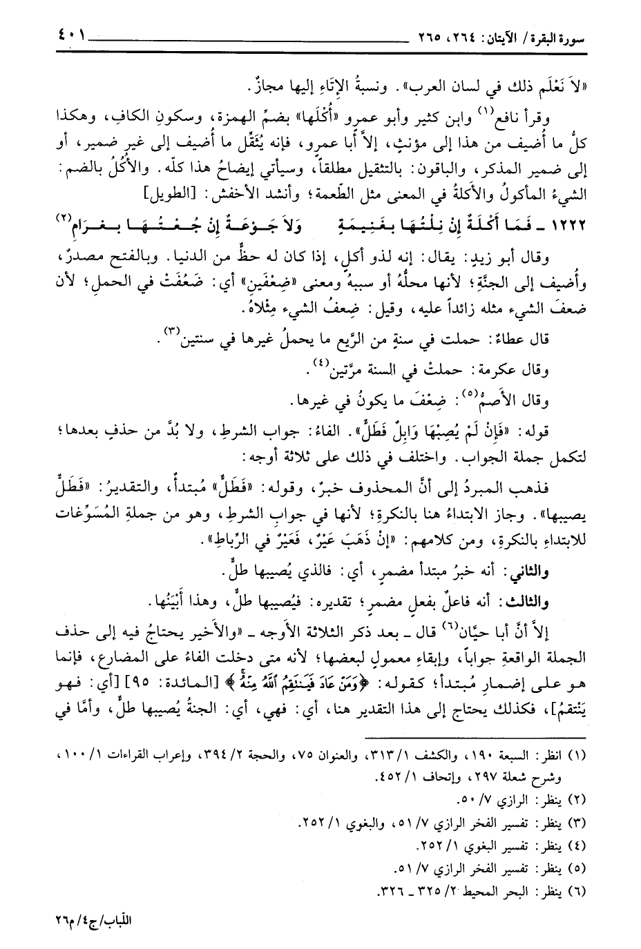 وقرأ نافع وابن كثير وأبو عمرو " أكلها " بضم الهمزة، وسكون الكاف، وهكذا كل ما أضيف من هذا إلى مؤنث، إلا أبا عمرو، فإنه يثقل ما أضيف إلى غير ضمير، أو إلى ضمير المذكر، والباقون: بالتثقيل مطلقا، وسيأتي إيضاح هذا كله. والأكل بالضم: الشيء المأكول والأكلة في المعنى مثل الطعمة؛ وأنشد الأخفش: [الطويل] 1222 -