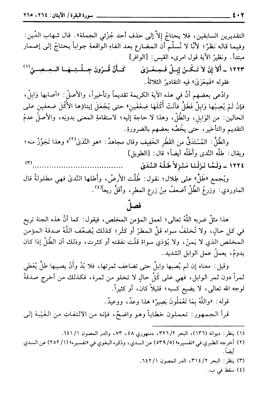 هذا مثل ضربه الله تعالى؛ لعمل المؤمن المخلص، فيقول: كما أن هذه الجنة تريع في كل حال، ولا تخلف سواء قل المطر أو كثر؛ كذلك يضعف الله صدقة المؤمن المخلص الذي لا يمن، ولا يؤذي سواء قلت نفقته أو كثرت، وذلك أن الطل إذا كان يدوم، يعمل عمل الوابل الشديد.