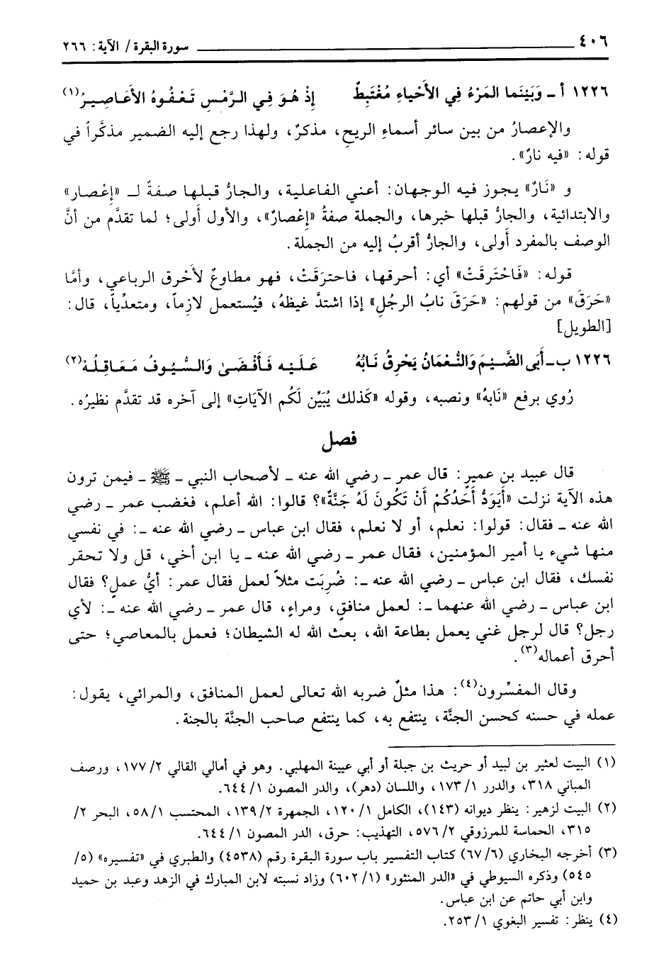 قال عبيد بن عمير: قال عمر - رَضِيَ اللَّهُ عَنْه - لأصحاب النبي - صَلَّى اللَّهُ عَلَيْهِ وَسَلَّم َ - فيمن ترون هذه الآية نزلت {أَيَوَدُّ أَحَدُكُمْ أَن تَكُونَ لَهُ جَنَّةٌ} ؟ قالوا: الله أعلم، فغضب عمر - رَضِيَ اللَّهُ عَنْه - فقال: قولوا: نعلم، أو لا نعلم، فقال ابن عباس - رَضِيَ اللَّهُ عَنْه -: في نفسي منها شيء يا أمير المؤمنين، فقال عمر - رَضِيَ اللَّهُ عَنْه - يا ابن أخي، قل ولا تحقر نفسك، فقال ابن عباس - رَضِيَ اللَّهُ عَنْه -: ضُرِبَت مثلاً لعمل فقال عمر: أيُّ عملٍ؟ فقال ابن عباس - رَضِيَ اللَّهُ عَنْهما -: لعمل منافقٍ، ومراءٍ، قال عمر - رَضِيَ اللَّهُ عَنْه -: لأي رجل؟ قال لرجل غني يعمل بطاعة الله، بعث الله له الشيطان؛ فعمل بالمعاصي؛ حتى أحرق أعماله.