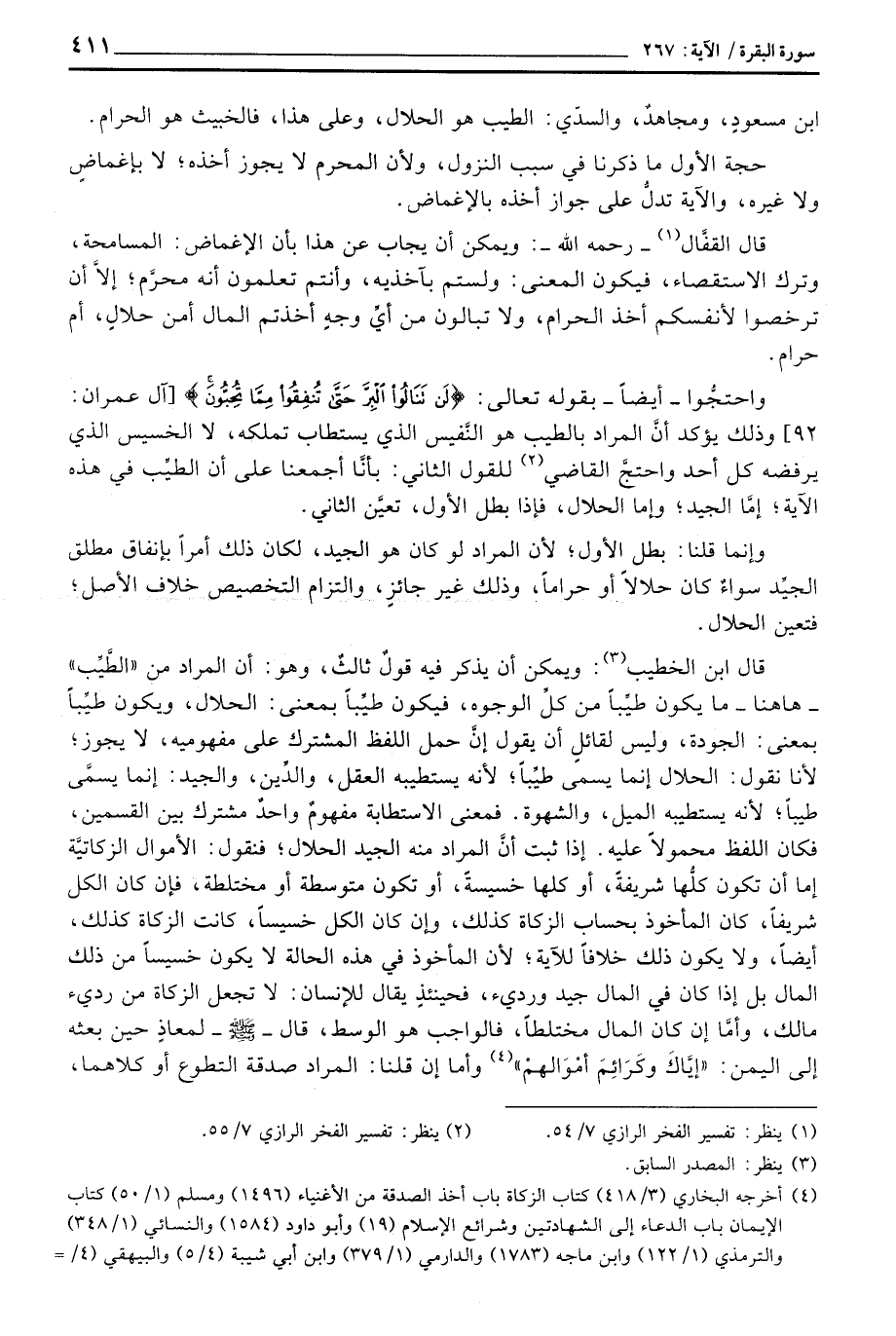 قال ابن الخطيب: ويمكن أن يذكر فيه قولٌ ثالثٌ، وهو: أن المراد من «الطِّيِّب» - هاهنا - ما يكون طيِّباً من كلِّ الوجوه، فيكون طيّباً بمعنى: الحلال، ويكون طيِّباً بمعنى: الجودة، وليس لقائلٍ أن يقول إنَّ حمل اللفظ المشترك على مفهوميه، لا يجوز؛ لأنا نقول: الحلال إنما يسمى طيِّباً؛ لأنه يستطيبه العقل، والدِّين، والجيد: إنما يسمَّى طيباً؛ لأنه يستطيبه الميل، والشهوة. فمعنى الاستطابة مفهومٌ واحدٌ مشترك بين القسمين، فكان اللفظ محمولاً عليه. إذا ثبت أنَّ المراد منه الجيد الحلال؛ فنقول: الأموال الزكاتيَّة إما أن تكون كلُّها شريفةً، أو كلها خسيسةٌ، أو تكون متوسطة أو مختلطة، فإن كان الكل شريفاً، كان المأخوذ بحساب الزكاة كذلك، وإن كان الكل خسيساً، كانت الزكاة كذلك، أيضاً، ولا يكون ذلك خلافاً للآية؛ لأن المأخوذ في هذه الحالة لا يكون خسيساً من ذلك المال بل إذا كان في المال جيد ورديء، فحينئذٍ يقال للإنسان: لا تجعل الزكاة من رديء مالك، وأمَّا إن كان المال مختلطاً، فالواجب هو الوسط، «قال - صَلَّى اللَّهُ عَلَيْهِ وَسَلَّم َ - لمعاذٍ حين بعثه إلى اليمن:» إِيَّاكَ وكَرَائِمَ أَمْوَالهمْ «وأما إن قلنا: المراد صدقة التطوع أو كلاهما،