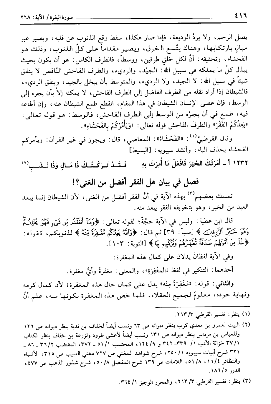 تمسك بعضهم بهذه الآية في أنَّ الفقر أفضل من الغنى، لأن الشيطان إنما يبعد العبد من الخير، وهو بتخويفه الفقر يبعد منه.