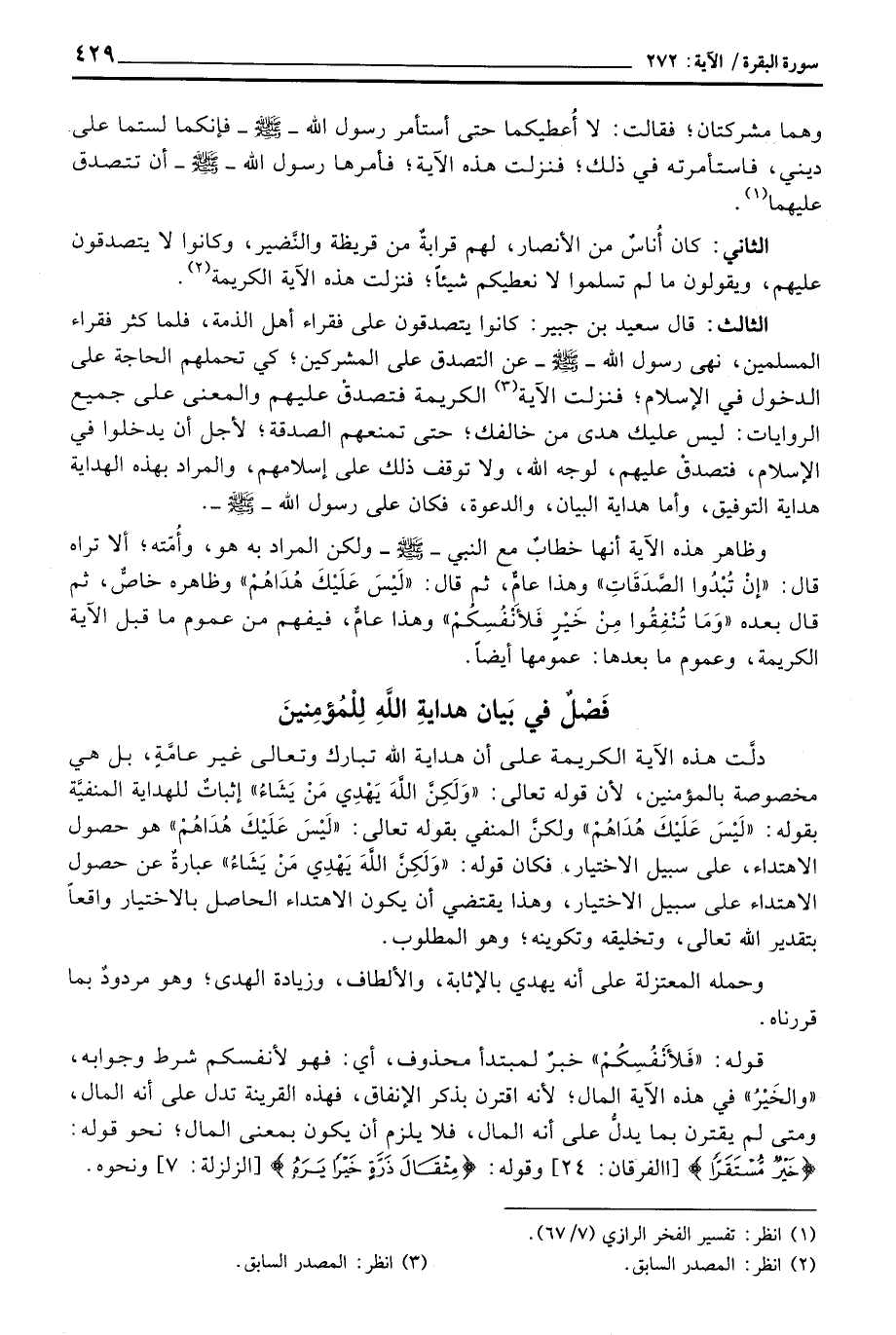 الثالث: قال سعيد بن جبير: كانوا يتصدقون على فقراء أهل الذمة، فلما كثر فقراء المسلمين، نهى رسول الله - صَلَّى اللَّهُ عَلَيْهِ وَسَلَّم َ - عن التصدق على المشركين؛ كي تحملهم الحاجة على الدخول في الإسلام؛ فنزلت الآية الكريمة فتصدق عليهم والمعنى على جميع الروايات: ليس عليك هدى من خالفك؛ حتى تمنعهم الصدقة؛ لأجل أن يدخلوا في الإسلام، فتصدقْ عليهم، لوجه الله، ولا توقف ذلك على إسلامهم، والمراد بهذه الهداية هداية التوفيق، وأما هداية البيان، والدعوة، فكان على رسول الله - صَلَّى اللَّهُ عَلَيْهِ وَسَلَّم َ -.