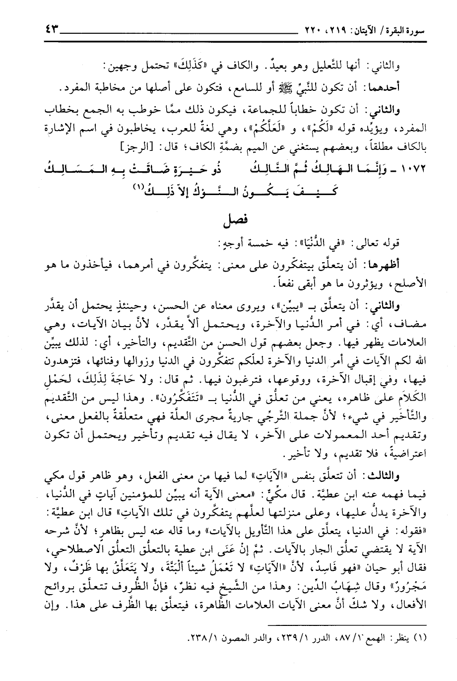 والثاني: أن يتعلَّق ب» يبيِّن «، ويروى معناه عن الحسن، وحينئذٍ يحتمل أن يقدَّر مضاف، أي: في أمر الدُّنيا والآخرة، ويحتمل ألاَّ يقدَّر، لأنَّ بيان الآيات، وهي العلامات يظهر فيها. وجعل بعضهم قول الحسن من التَّقديم، والتأخير، أي: ليس لذلك يبيِّن الله لكم الآيات في أمر الدنيا والآخرة لعلَّكم تتفكَّرون في الدنيا وزوالها وفنائها، فتزهدون فيها، وفي إقبال الآخرة، ووقوعها، فترغبون فيها. ثم قال: ولا حَاجَةَ لِذَلِكَ، لحَمْلِ الكَلاَمِ على ظاهره، يعني من تعلُّق في الدُّنيا ب» تَتَفَكَّرُونَ «. وهذا ليس من التَّقديم والتَّأخير في شيء؛ لأنَّ جملة التَّرجِّي جاريةٌ مجرى العلَّة فهي متعلِّقةٌ بالفعل معنى، وتقديم أحد المعمولات على الآخر، لا يقال فيه تقديم وتأخير ويحتمل أن تكون اعتراضيةً، فلا تقديم، ولا تأخير.