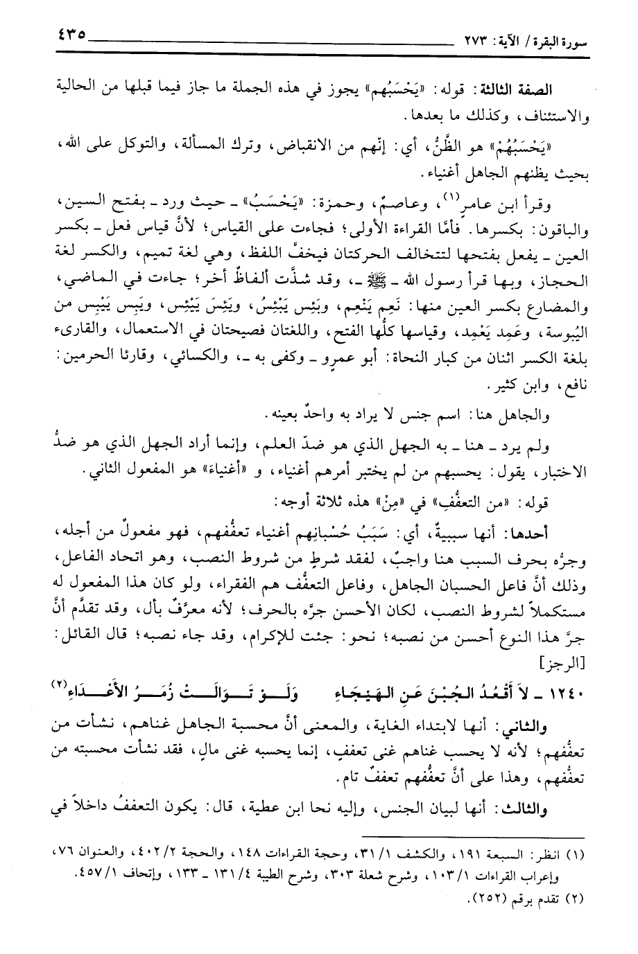 «يَحْسَبُهُمْ» هو الظَّنُّ، أي: إنّهم من الانقباض، وترك المسألة، والتوكل على الله، بحيث يظنهم الجاهل أغنياء.