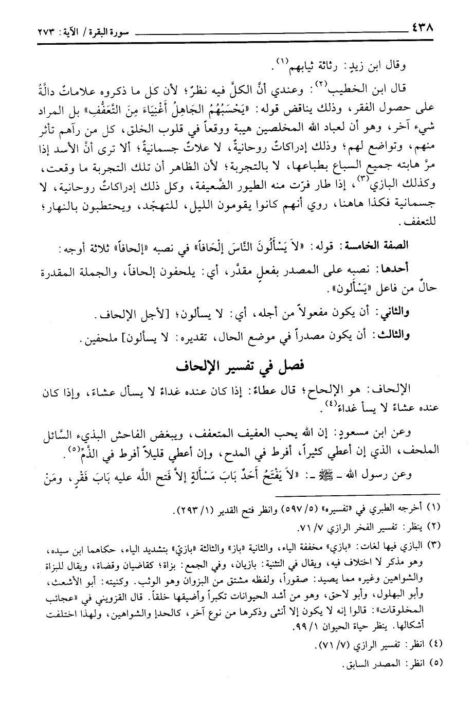 الصفة الخامسة: قوله: {لاَ يَسْأَلُونَ الناس إِلْحَافاً} في نصبه «إلحافاً» ثلاثة أوجه: