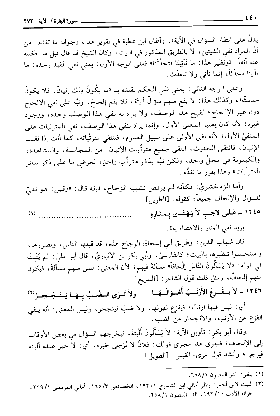 وقال أبو بكرٍ: تأويل الآية: لاَ يَسْأَلُونَ أَلْبَتةَ، فيخرجهم السؤال في بعض الأوقات إلى الإلحاف؛ فجرى هذا مجرى قولك: فلانٌ لا يُرْجى خيره، أي: لا خير عنده ألبتة فيرجى؛ وأنشد قول امرئ القيس: [الطويل]
