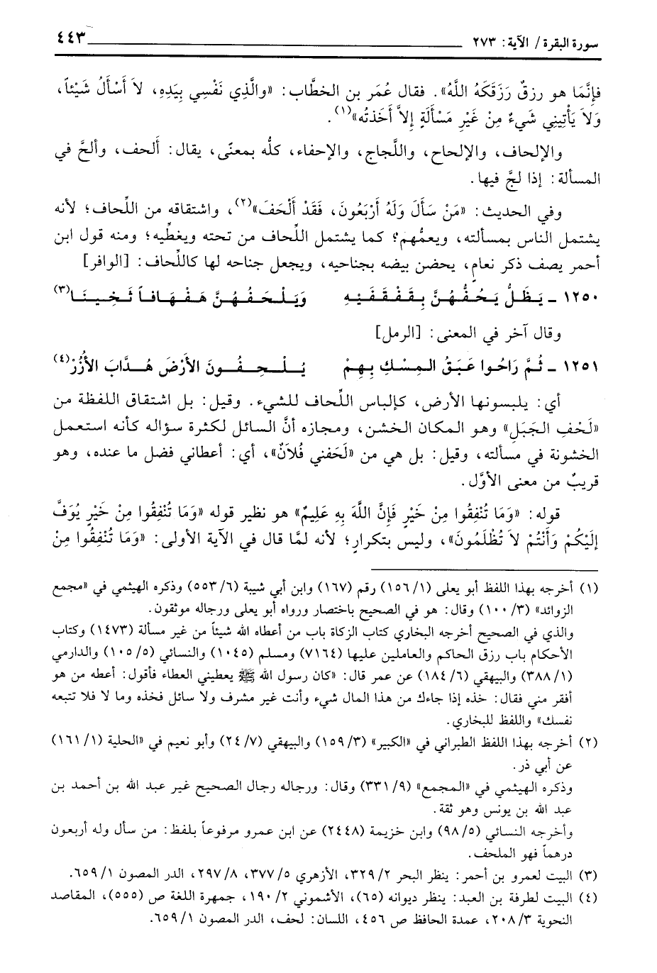 أي: يلبسونها الأرض، كإلباس اللِّحاف للشيء. وقيل: بل اشتقاق اللفظة من» لَحْفِ الجَبَلِ «وهو المكان الخشن، ومجازه أنَّ السائل لكثرة سؤاله كأنه استعمل الخشونة في مسألته، وقيل: بل هي من» لَحَفني فُلاَنٌ «، أي: أعطاني فضل ما عنده، وهو قريبٌ من معنى الأوَّل.