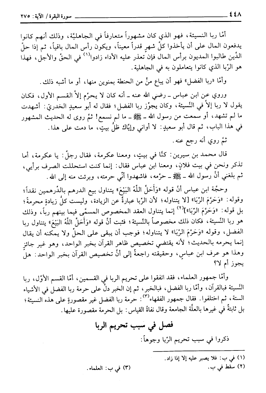 فقال جمهور الفقهاء: حرمة ربا الفضل غير مقصورةٍ على هذه النسيئة؛ بل ثابتةٌ في غيرها بالعلَّة الجامعة وقال نفاةُ القياس: بل الحرمة مقصورة عليها.