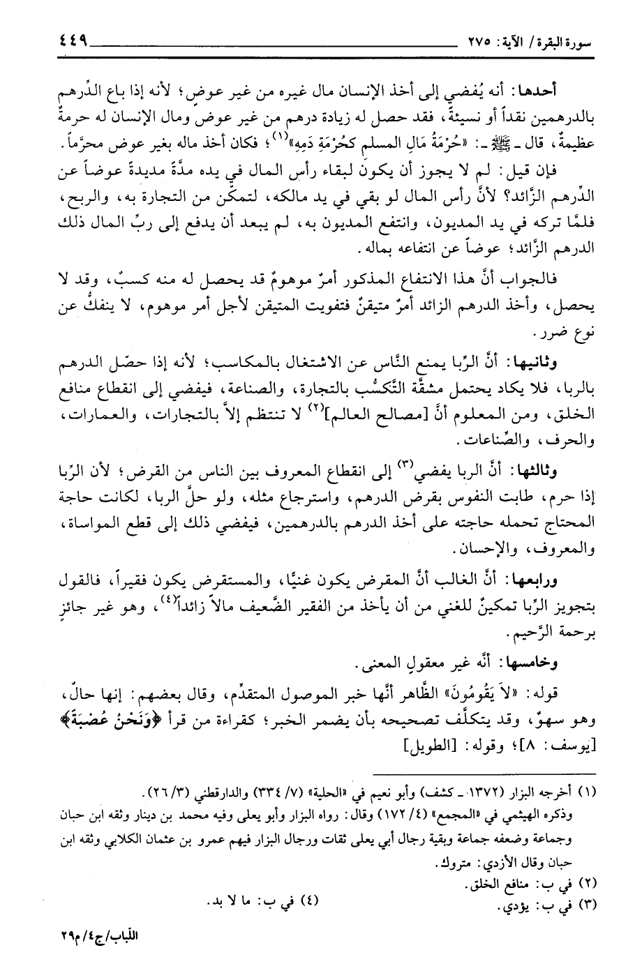 ورابعها: أنَّ الغالب أنَّ المقرض يكون غنيّاً، والمستقرض يكون فقيراً، فالقول بتجويز الرِّبا تمكينٌ للغني من أن يأخذ من الفقير الضَّعيف مالاً زائداً، وهو غير جائزٍ برحمة الرَّحيم.