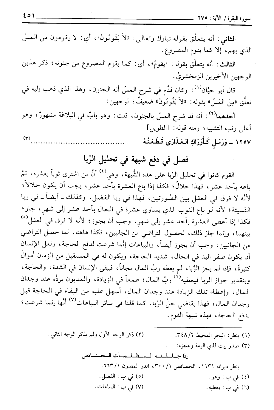 القوم كانوا في تحليل الرِّبا على هذه الشُّبهة، وهي أنَّ من اشترى ثوباً بعشرة، ثمَّ باعه بأحد عشر، فهذا حلالٌ؛ فكذا إذا باع العشرة بأحد عشر، يجب أن يكون حلالاً؛ لأنه لا فرق في العقل بين الصُّورتين، فهذا في ربا الفضل، وكذلك - أيضاً - في ربا النَّسيئة؛ لأنه لو باع الثوب الذي يساوي عشرة في الحال بأحد عشر إلى شهرٍ، جاز، فكذا إذا أعطى العشرة بأحد عشر إلى شهرٍ، وجب أن يجوز؛ لأنه لا فرق في العقل بينهما، وإنما جاز ذلك، لحصول التراضي من الجانبين، فكذا هاهنا، لما حصل التراضي من الجانبين، وجب أن يجوز أيضاً، والبياعات إنَّما شرعت لدفع الحاجة، ولعل الإنسان أن يكون صفر اليد في الحال، شديد الحاجة، ويكون له في المستقبل من الزمان أموالٌ كثيرةٌ، فإذا لم يجز الرِّبا، لم يعطه ربُّ المال مجاناً، فيبقى الإنسان في الشدة، والحاجة، وبتقدير جواز الربا فيعطيه ربُّ المال؛ طمعاً في الزيادة، والمديون يردُّه عند وجدان المال، وإعطاء تلك الزيادة عند وجدان المال، أسهل عليه من البقاء في الحاجة قبل وجدان المال، فهذا يقتضي حلَّ الرِّبا، كما قلنا في سائر البياعات أنَّها إنما شرعت؛ لدفع الحاجة، فهذه شبهة القوم.
