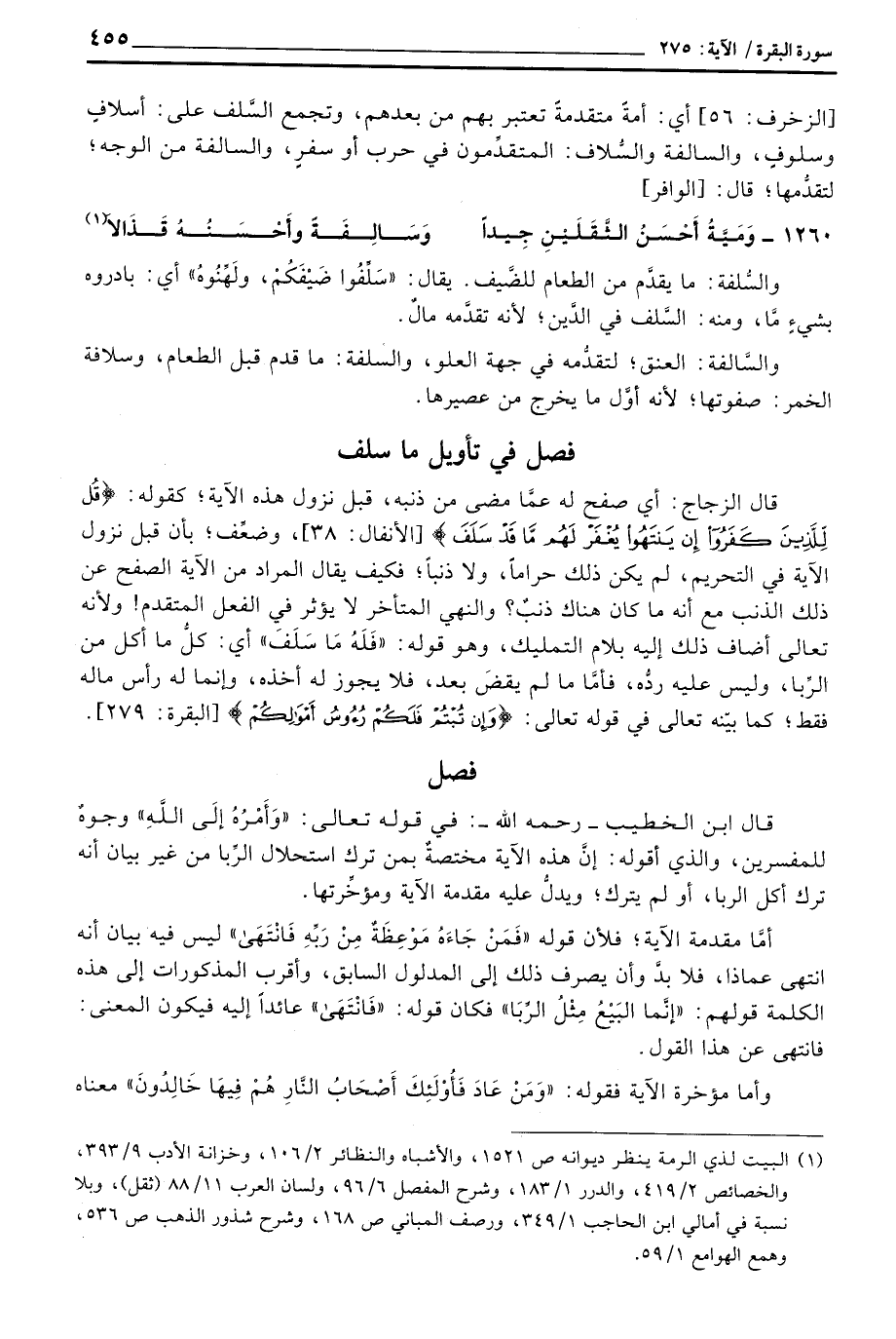 قال ابن الخطيب - رَحِمَهُ اللَّهُ -: في قوله تعالى: {وَأَمْرُهُ إِلَى الله} وجوهٌ للمفسرين، والذي أقوله: إنَّ هذه الآية مختصةٌ بمن ترك استحلال الرِّبا من غير بيان أنه ترك أكل الربا، أو لم يترك؛ ويدلُّ عليه مقدمة الآية ومؤخِّرتها.